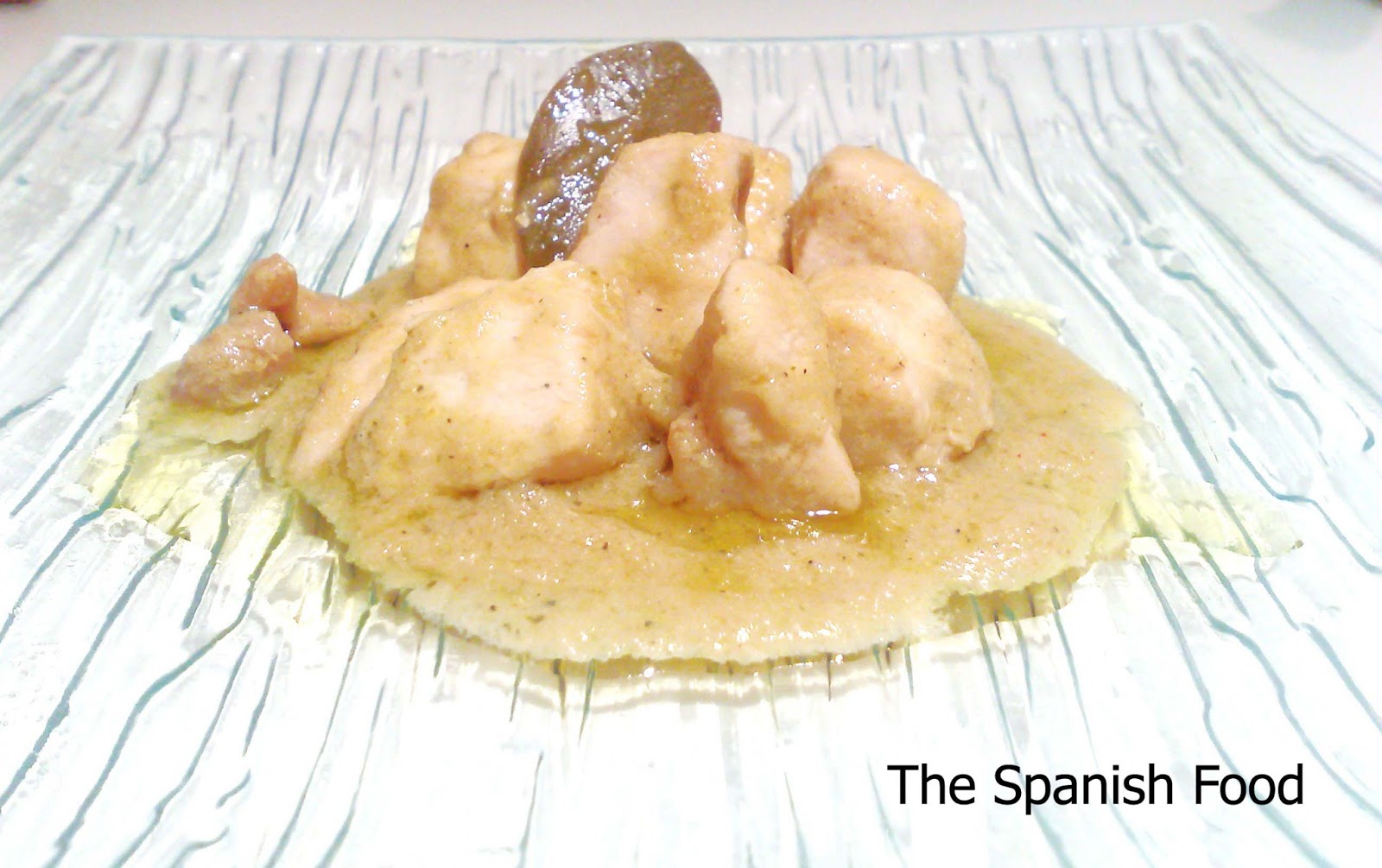 En un plato de servir, colocar unos dados de pollo, un poco de la salsa alrededor.