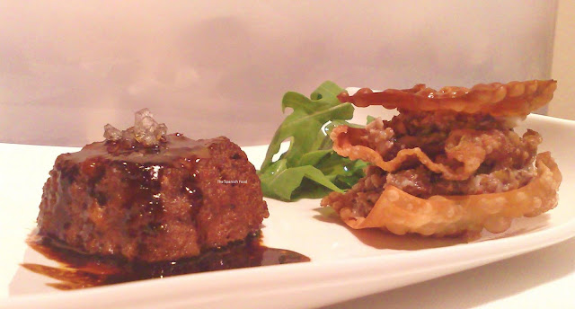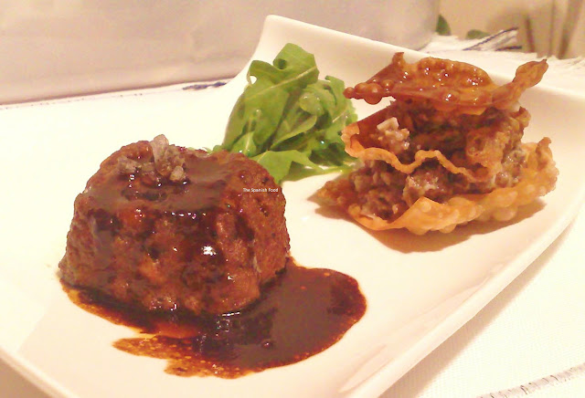 Con un molde, darle forma de cubo a la carne y sellarla en una sartén muy caliente con unas gotas de aceite de oliva virgen, por los cuatro lados. El punto de cocción depende del gusto de cada uno.