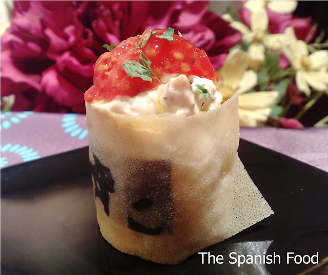 En un platito, colocamos un aro de pasta brick. Con cuidado colocamos dentro la ensalada de pollo con nata. Encima colocamos unas semillas de tomate.