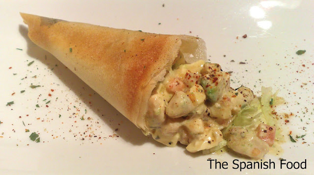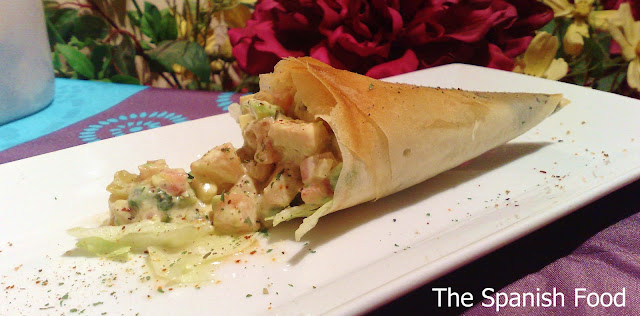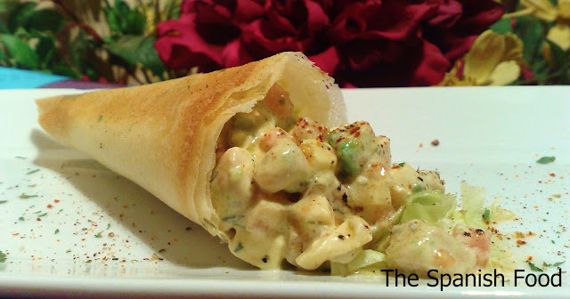 La tercera de las recetas de tapas sencillas es un cornete de pasta brick relleno de ensalada y una salsa cremosa a base de crema cresca y mostaza. Dependiendo del tamaño de los cornetes podría servir como un aperitivo o como un primer plato.