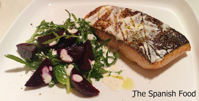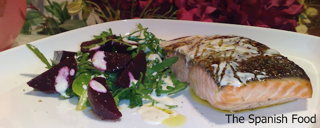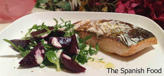 Esta receta no recuerdo exactamente dónde la ví, creo que en un libro de Jamie Oliver, pero me pareció exisita y no he podido resistirme a probarla. Teníamos los lomos de salmón, las remolachas mini y las hojas verdes de Pascual así que la ocasión era perfecta.