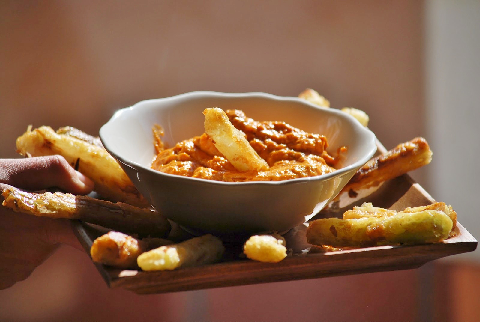 Los viernes suelo ir a la verdulería, vi que aún tenían calçots, como en casa no puedo hacerlos al fuego como me gustan, decidí hacerlos en tempura, acompañados de una salsa Romesco y otras verduras también en tempura con salsa de soja y aceite de oliva.