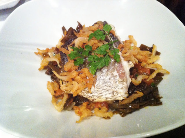| Corvina del sur, chanquetes, algas y vinagreta de adobo gaditano |