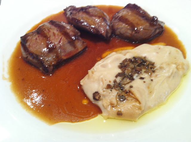 solomillo de ciervo con salsa de trufas y puré graso de