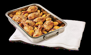 4. Coloque el pollo sobre las patatas e introduzca la bandeja en el horno. Déjelo hacer durante 45 min. hasta que la carne y las patatas estén hechas y doradas. Rocíelo a media cocción con el zumo. Sírvalo acompañado de una ensalada del tiempo.