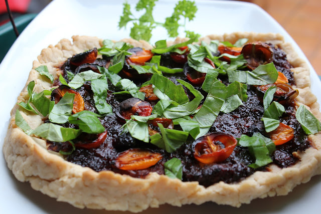 COCA DE CHERRYS CON CHUTNEY DE CEBOLLA Y ARÁNDANOS Y BAÑO DE ALBAHACA FRESCA