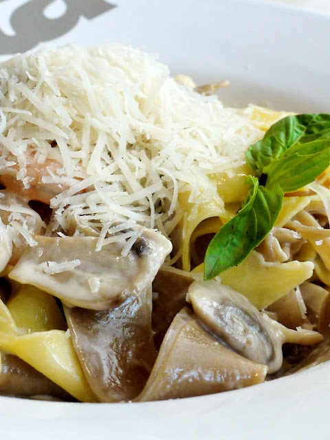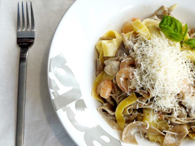 Un plato de pasta con gambas, champiñones y salsa de nata, con queso parmesano. Disfrutar de una buena comida y buen provecho!