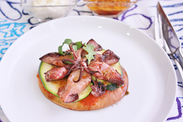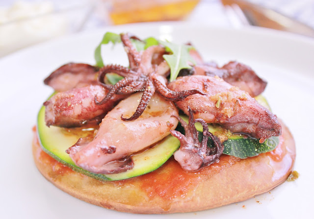 Sobre cada rebanada de pan o minipizza ponemos una cucharada de tomate rallado y un poco de sal. Encima colocamos unas rodajas de calabacín. Sobre ellas los chipirones calientes. Vertemos unas gotas de aceite de oliva por encima.