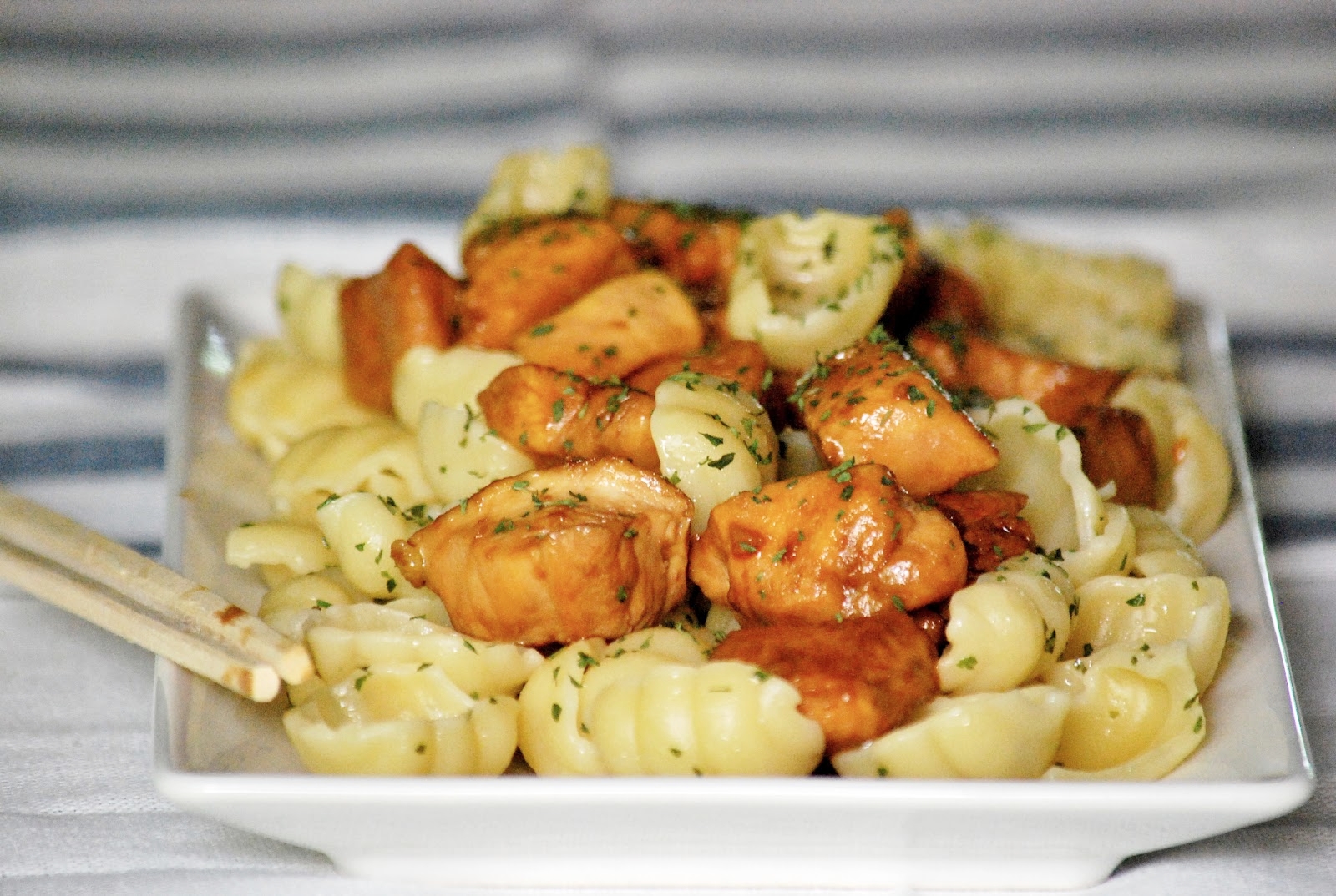 ha preparado una pasta clásica completada con unos dados de pollo teriyaki, una salsa japonesa, de sabor dulce, que le da brillo y sabor tanto a carnes como pescados asados.