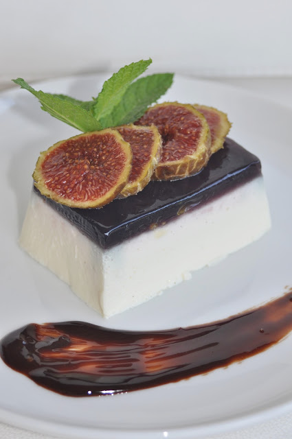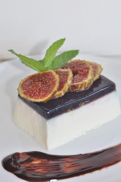 Colar los higos y con el líquido resultante preparar un gelée incorporando 4 hojas de gelatina, previamente remojada y escurrida por cada 1/2 litro de líquido.