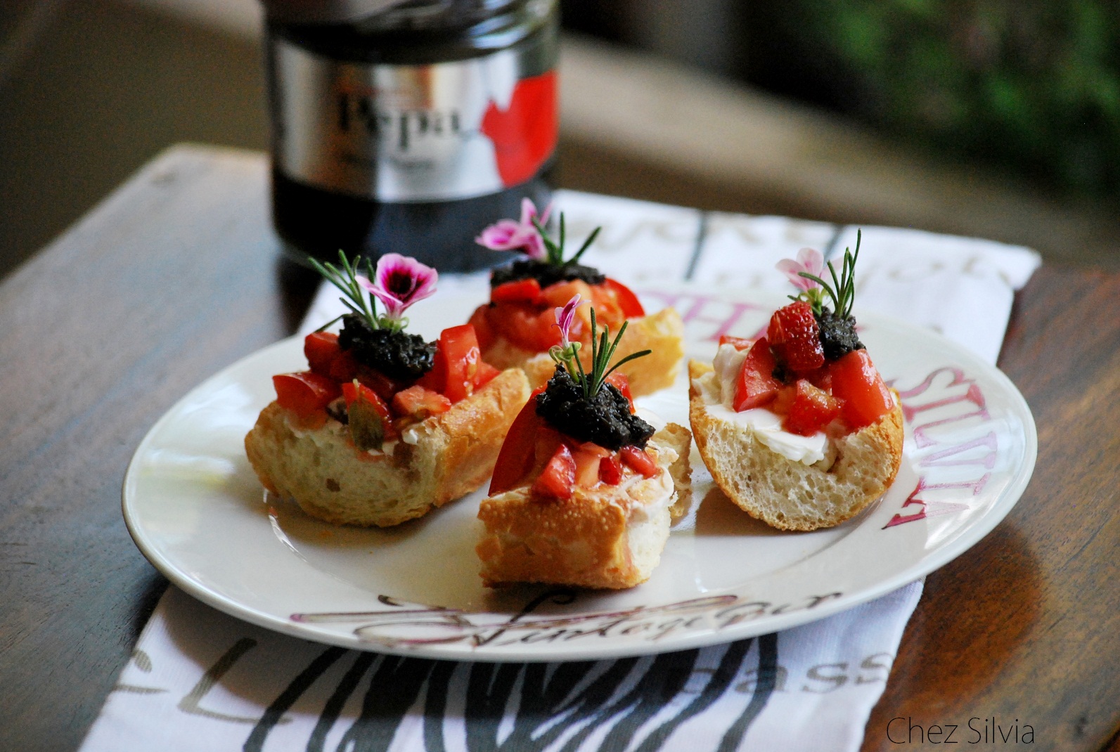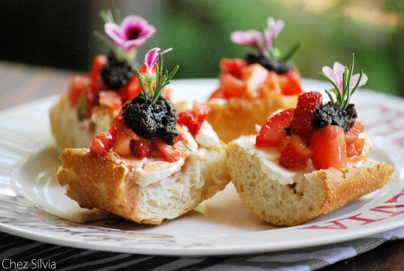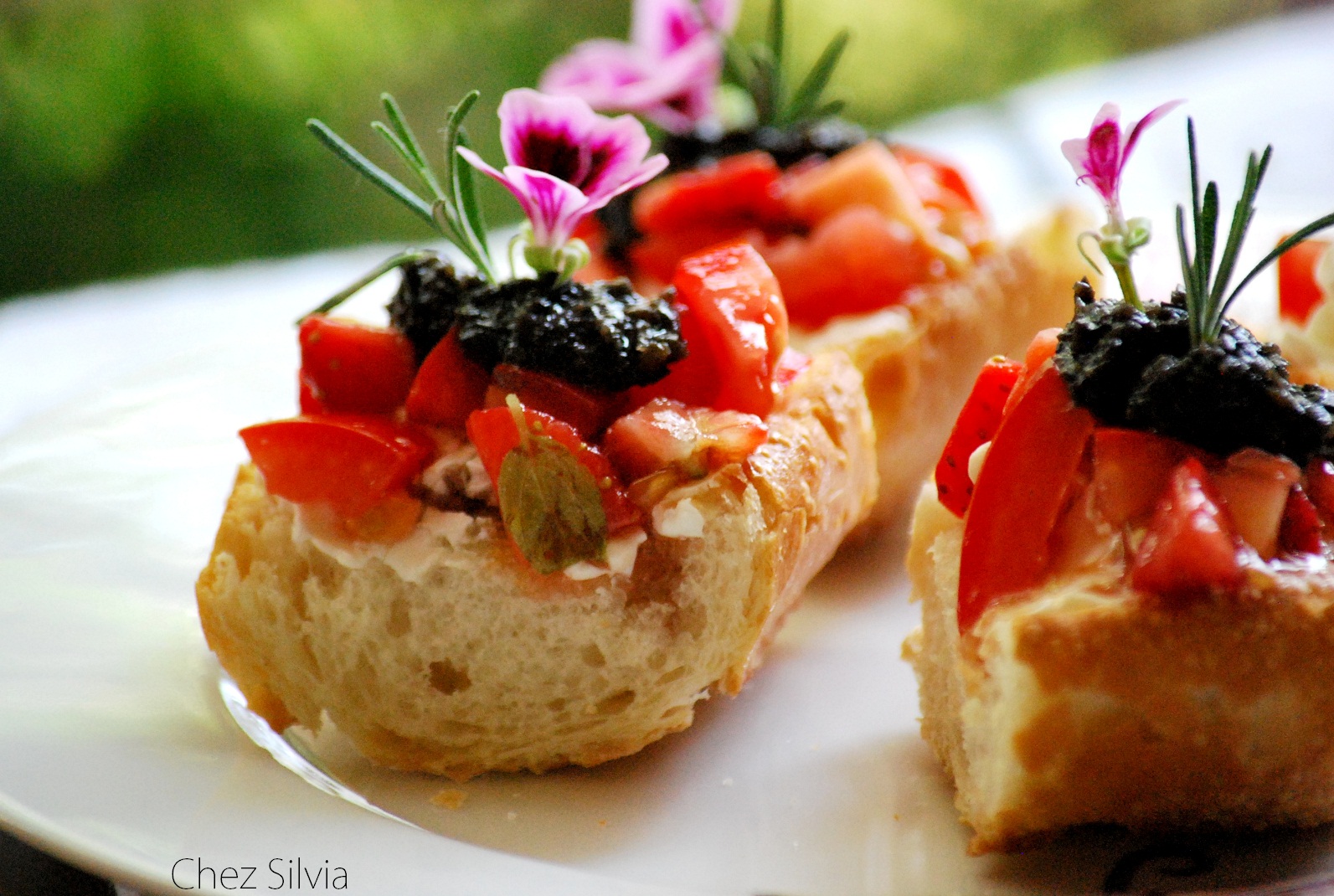 BRUSCHETTA DE QUESO CREMA, TOMATES, FRESAS Y OLIVADA BYPEPA