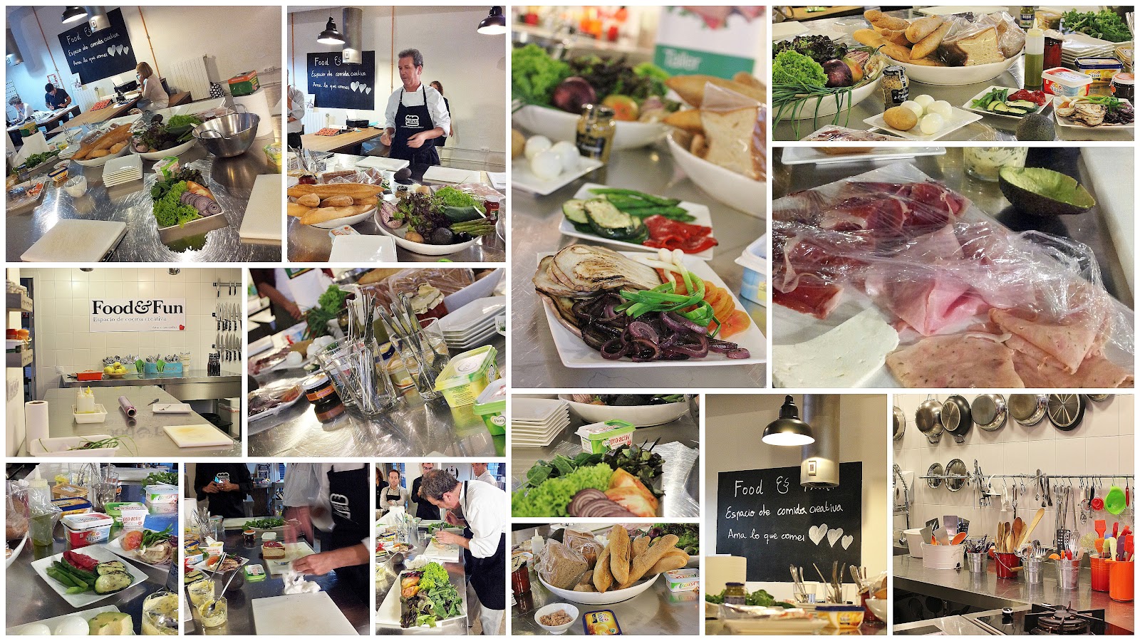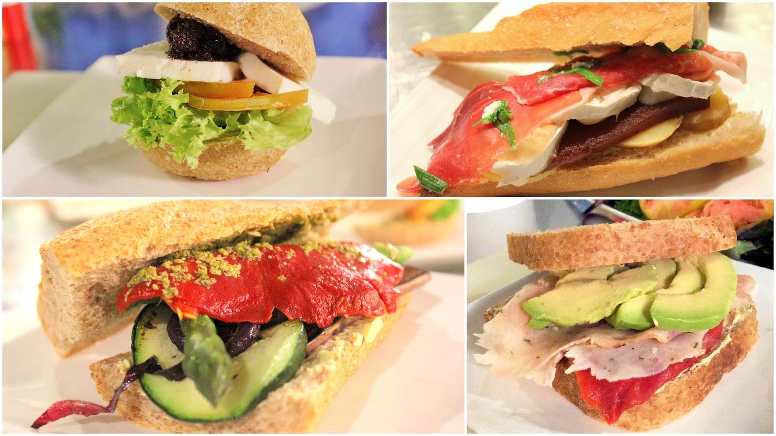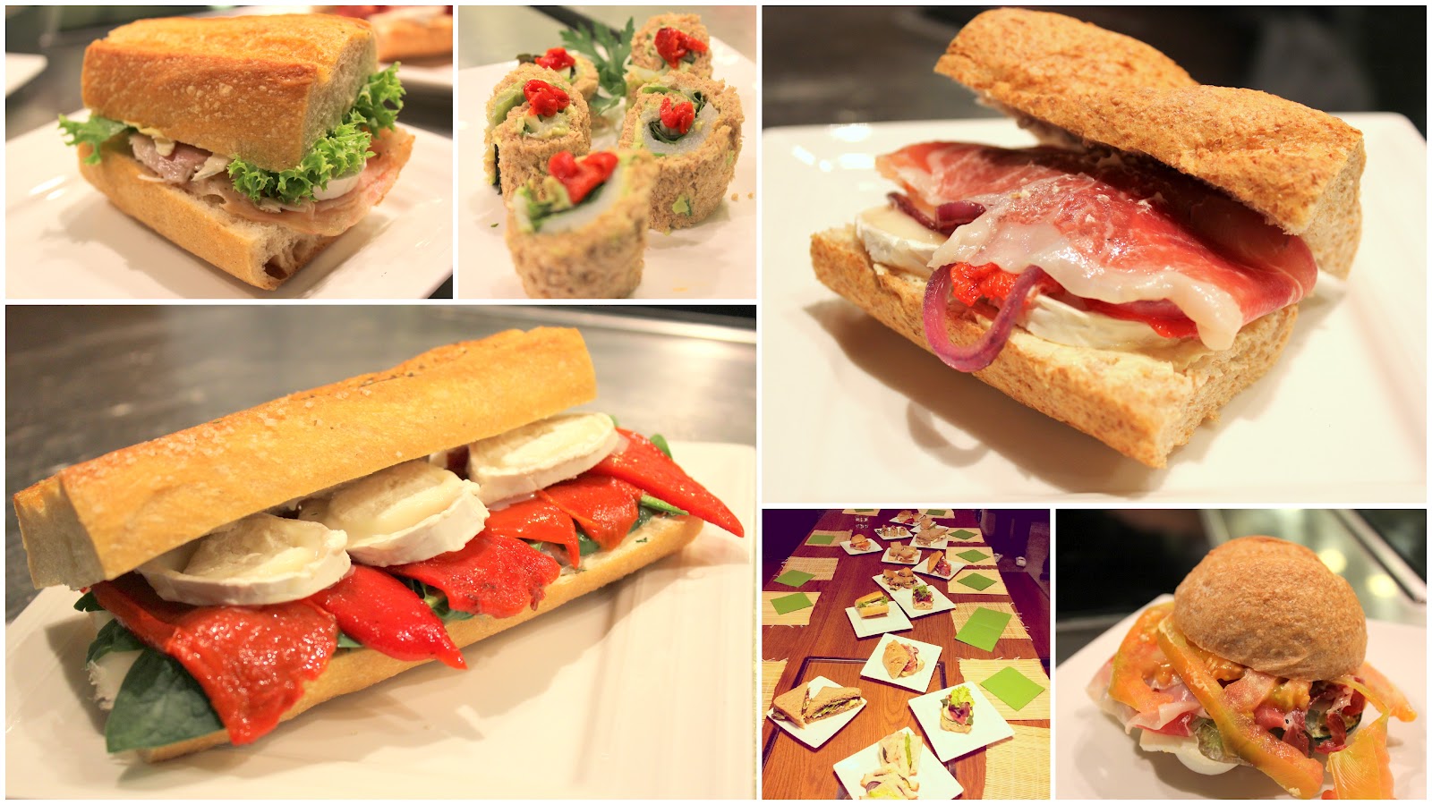 Y luego, cómo no, manos a la obra! Cada uno de los participantes preparamos unos bocadillos con los ingredientes que habéis podido ver en el segundo collage: verduras crudas y asadas, embutidos, queso, patata, membrillo, huevo, salsas varias y por supuesto las distintas variedades de margarinas: Flora, gourmet, sabor mantequilla, Tulipán pro-activ y ligeresa. La creatividad y gustos de cada uno dieron como resultado una bonita y deliciosa variedad de bocadillos, sandwiches, tostas, y hasta uno en forma de sushi de lo más original. Estos son algunos de los que prepararon y luego probamos