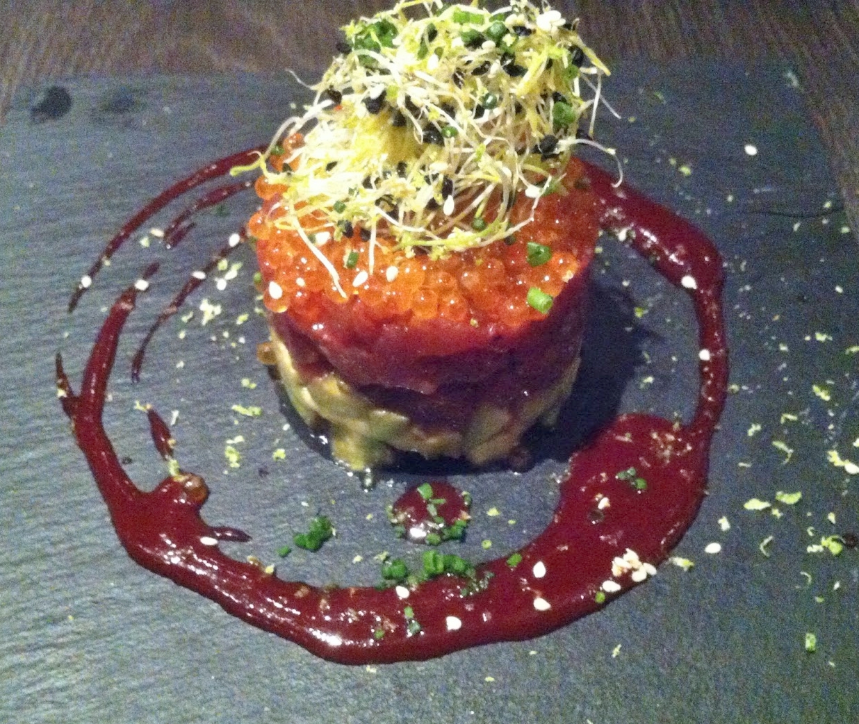 Un rico tartar de corvina , un pescado que he probado en alguna ocasión y que esta vez lo tomaba de manera diferente. Acompañado todo ello por una especie de salsa "made in China" en el buen sentido de la palabra, es decir, muy usada para platos asiáticos.