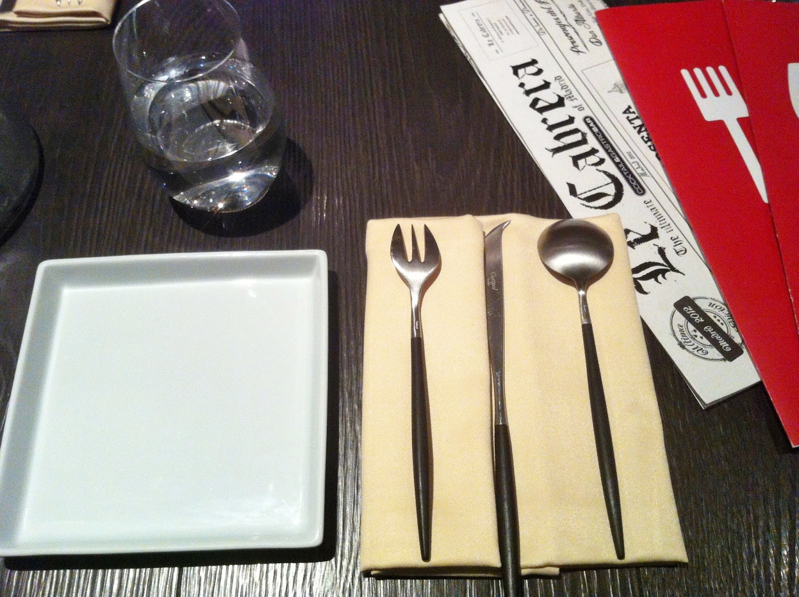 Me llamaron la atención los cubiertos , como diría mi querida madre, "muy monos pero poco útiles". Pues eso. He de decir, que una cosa que me gustó mucho, es que hubiese una jarra de agua fría en la mesa sin haberla pedido, tal y como hacen en EEUU, chapó por vosotros.