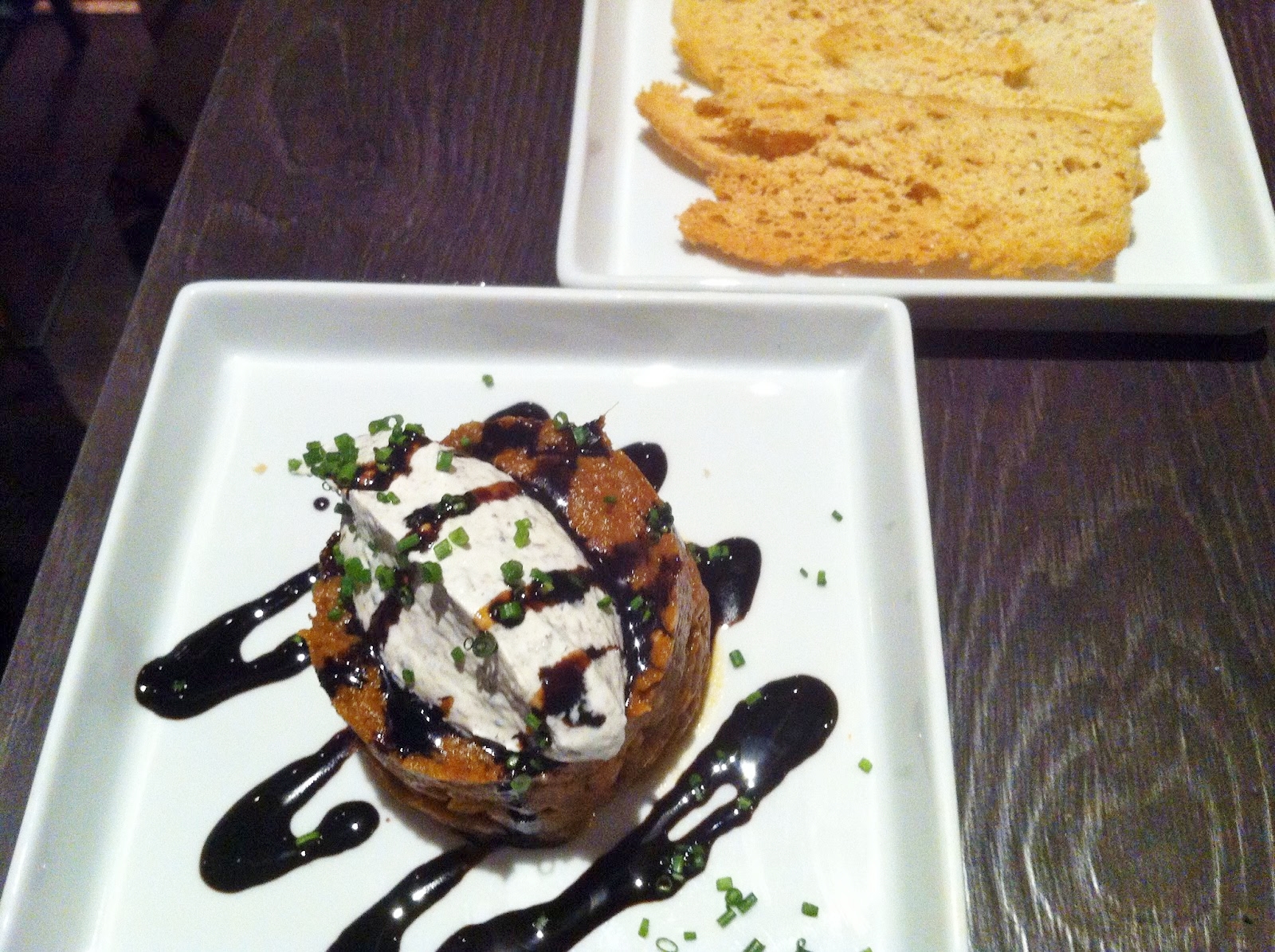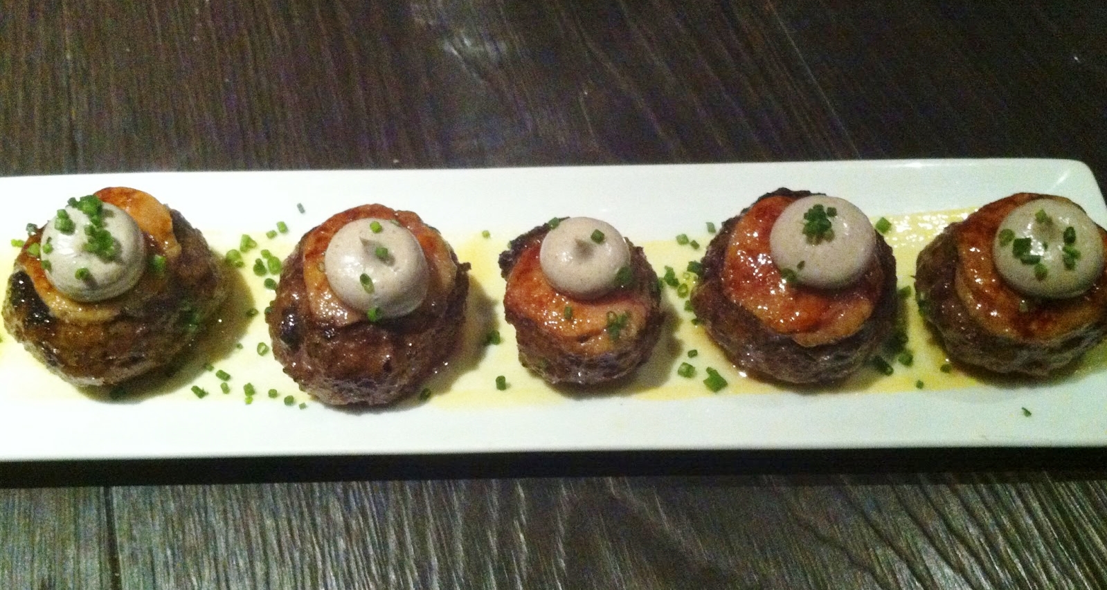 Para el deleite y babeo de los lectores, foto-precisión . Carne de ternera picada + foie caramelizado + crema de setas. Simplemente una maravilla, y una buena combinación de sabores.