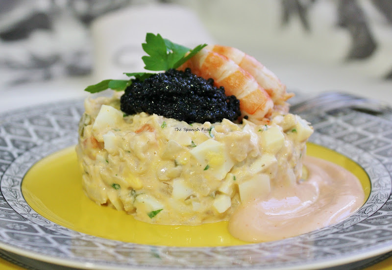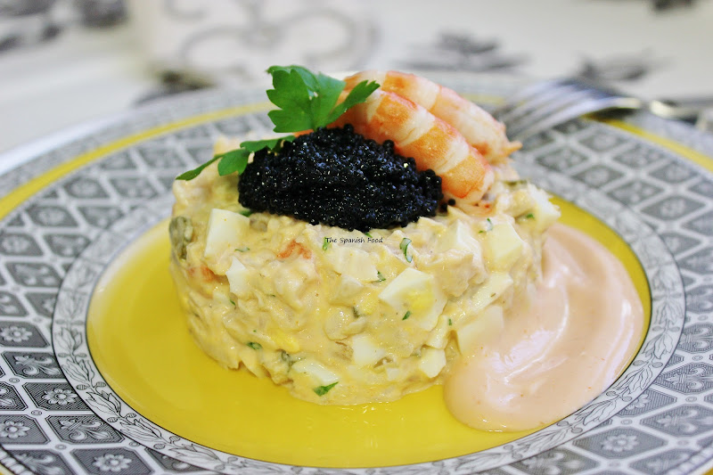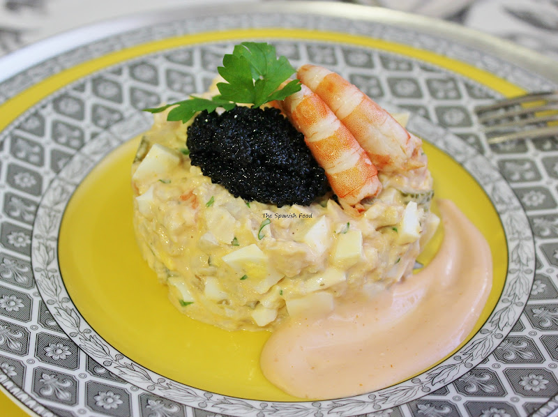 como entrante esta ensaladilla de merluza con langostinos y salsa rosa