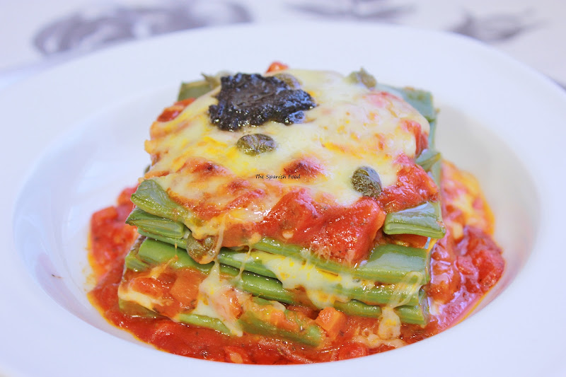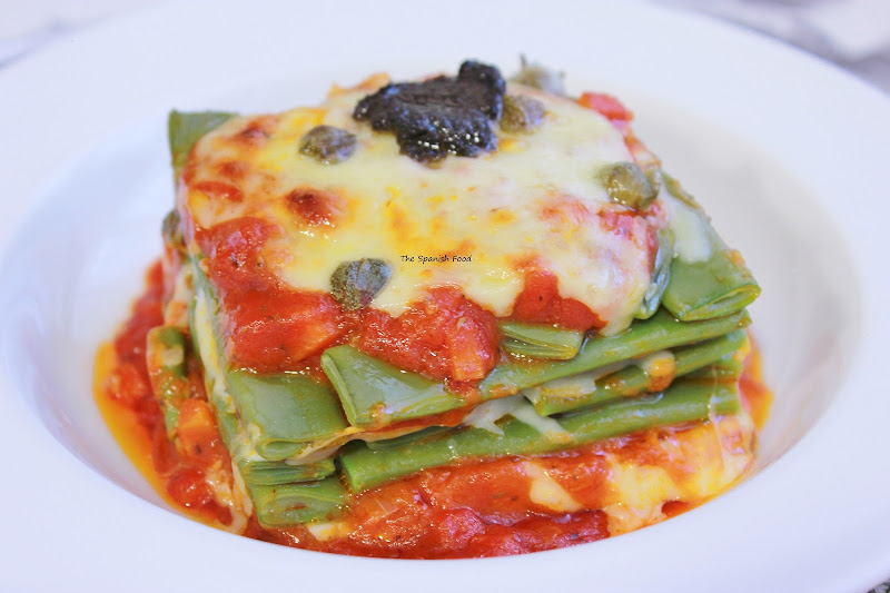 TIMBAL DE JUDIAS VERDES CON TOMATE Y QUESO GRATINADO