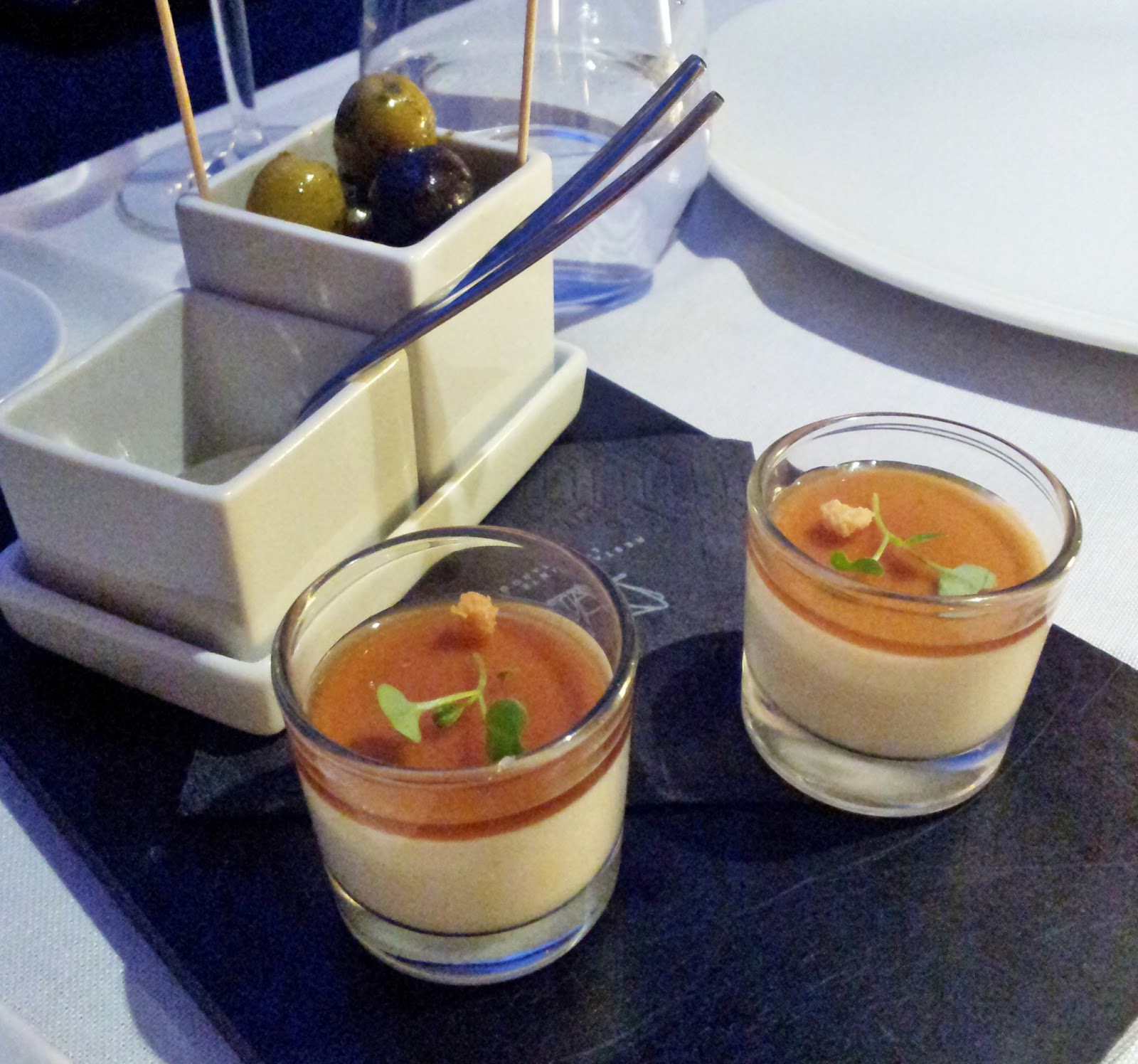 Nada más pedir, te traen un aperitivo, en esta ocasión compuesto por unas aceitunas negras y verdes aderezadas con hierbas y aceite de oliva buenísimas, y un chupito de mousse de queso compté con gelatina de balsámico y miel.