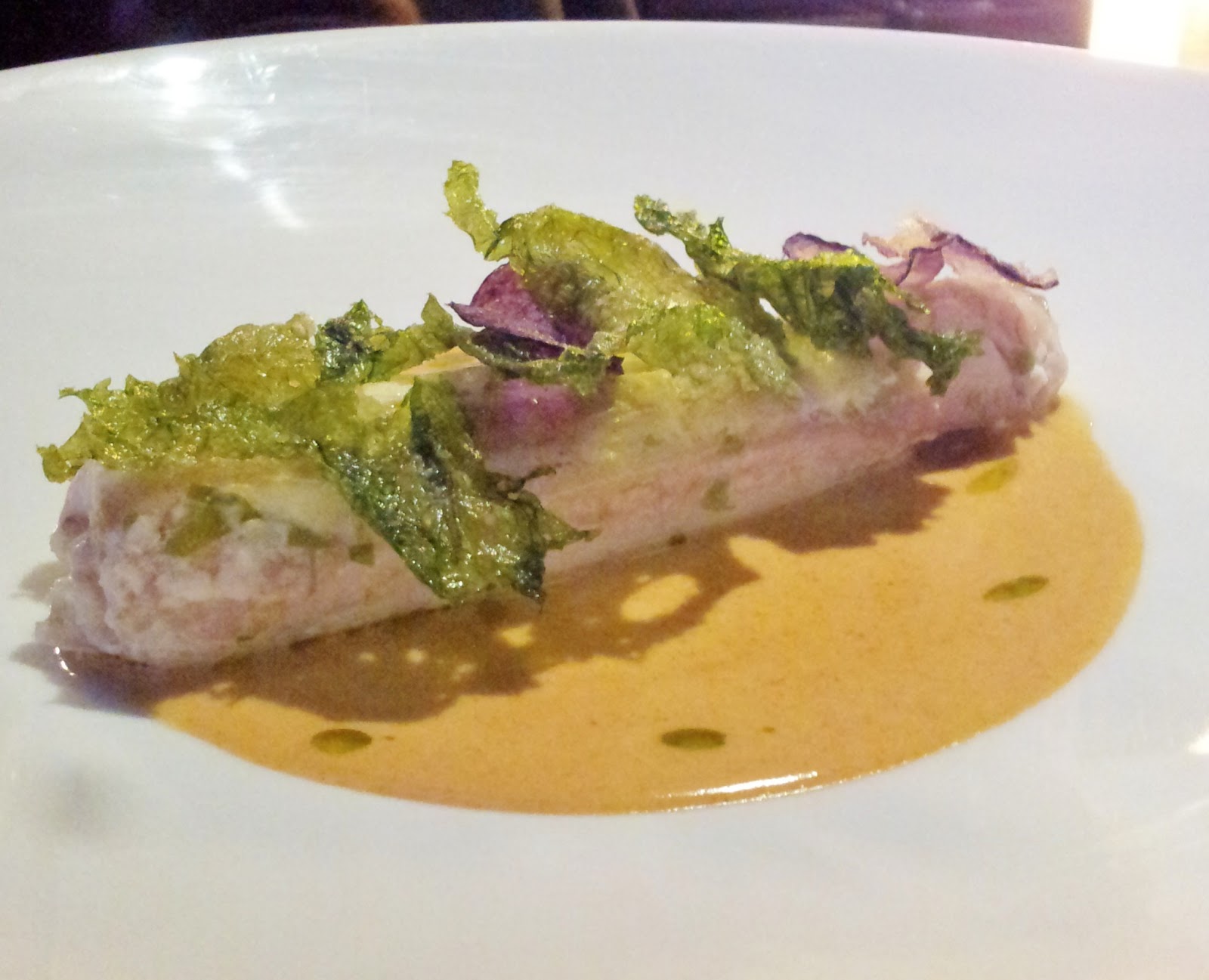 Otro de los platos, lenguado con salsa de erizos de mar con chips de patata violeta y algas. Sabor a mar, el lenguado bueno, pero la salsa de erizos, un 10.