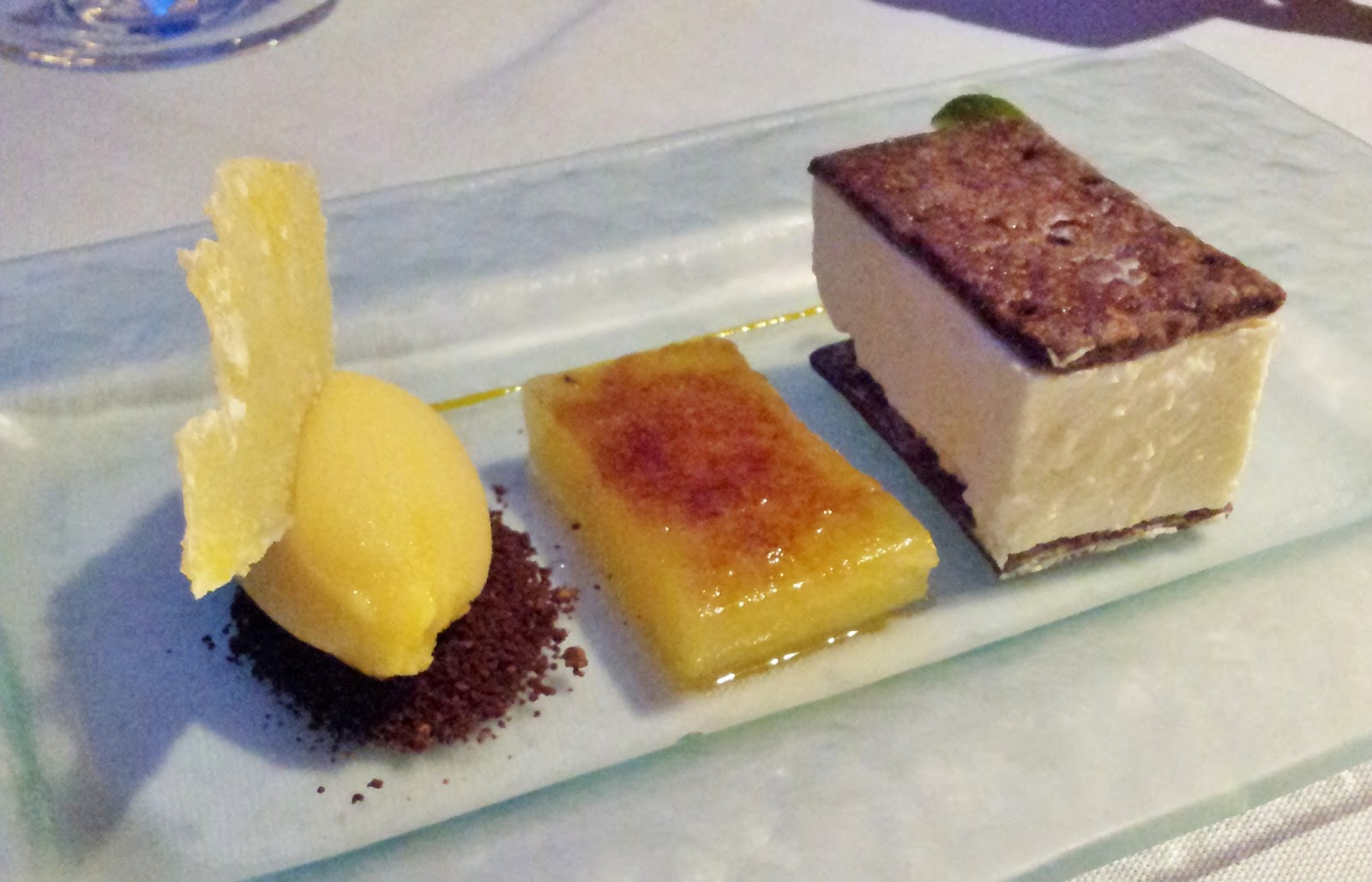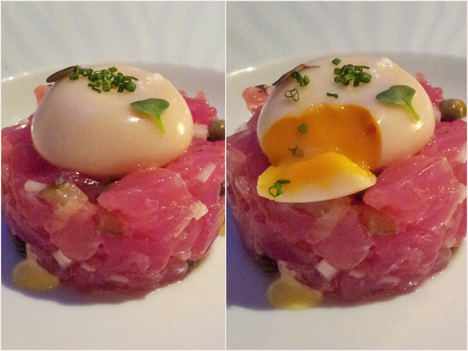 El siguiente plato, un steack tartare de atún con falso huevo, encurtidos y mayonesa de wasabi, y las mismas tostas extrafinas para acompañar. Otra delicia: el salmón extraordinario, los encurtidos, unas mini alcaparras, cebolla y pepinillo cortado muy diminuto y la mayonesa de wasabi perceptible lo justo. La yema del falso huevo, una sorpresa: una crema de mango que combinada a la perfección.