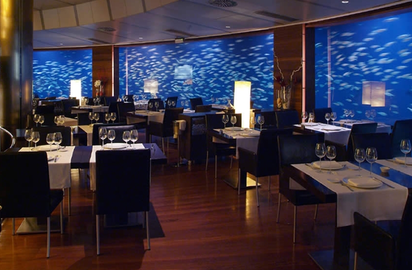 En la planta inferior se ubica el Restaurante Submarino , rodeado de un acuario circular integrado donde se puede disfrutar del contraste entre el azul intenso del agua y el color plateado de los peces que circulan alrededor de toda la sala. La sensación es la de comer bajo el agua. (podeis verlo en la primera imágen)