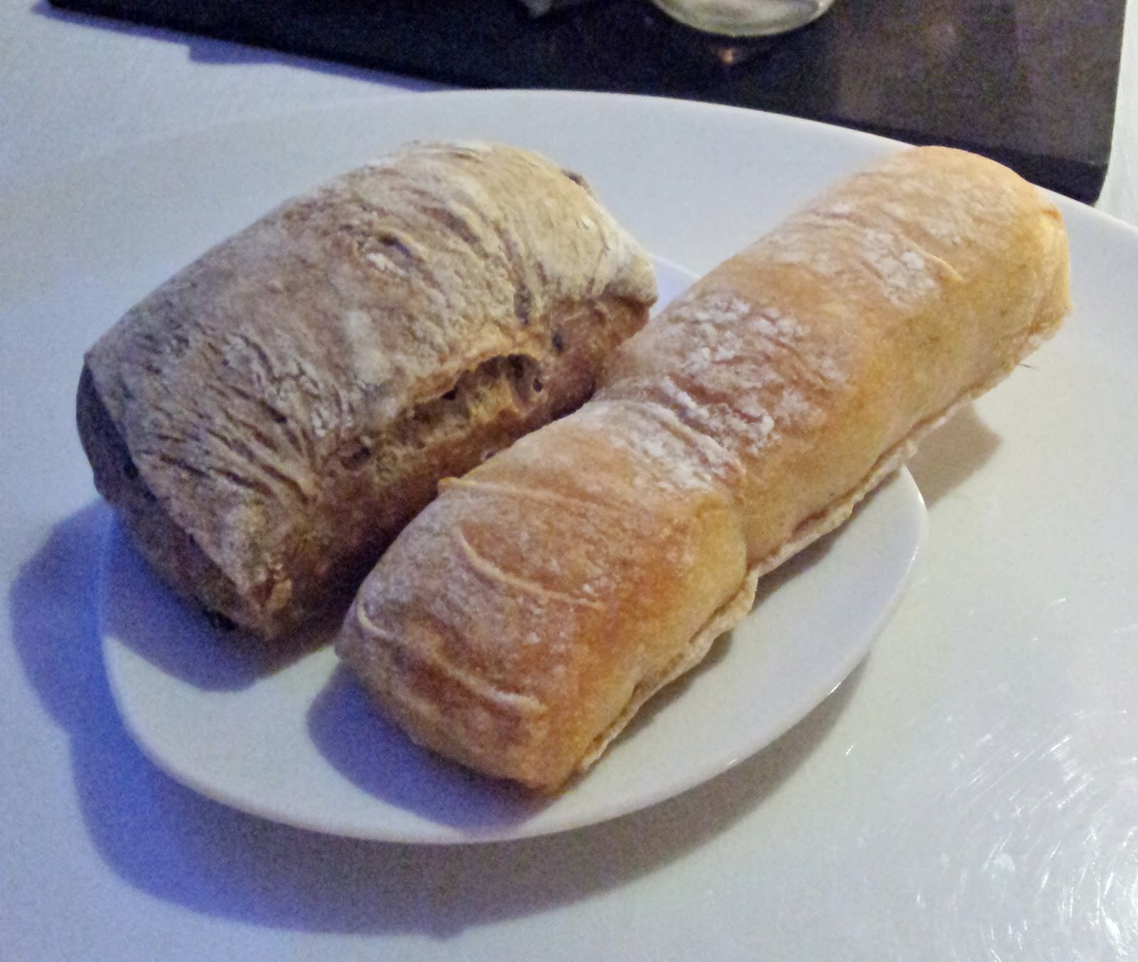 Y pan: tienes para elegir: normal, de centeno, de cebolla, de aceitunas negras y nueces, y de tomate. Yo elegí el de aceitunas negras y nueces y el de tomate; muy crujientes y buenos, aunque me gustó más el primero.