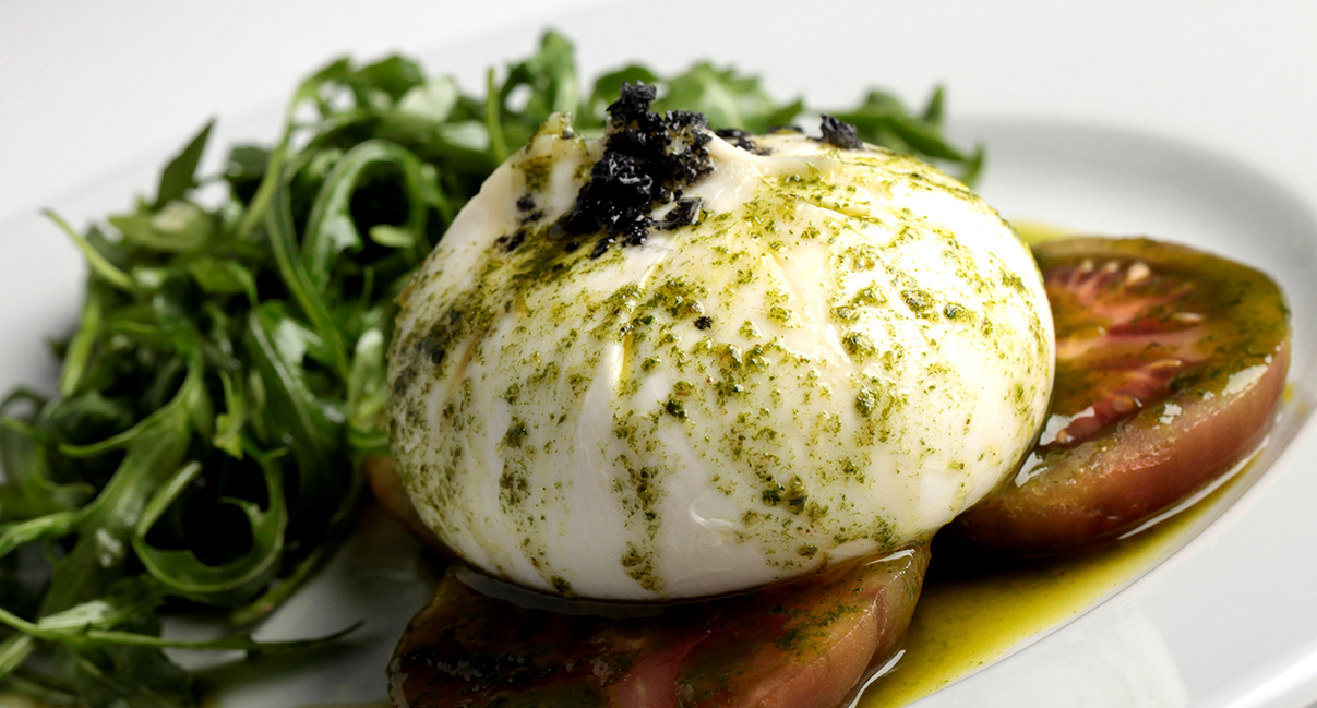 - Burrata con tomate kumato y rúcola.