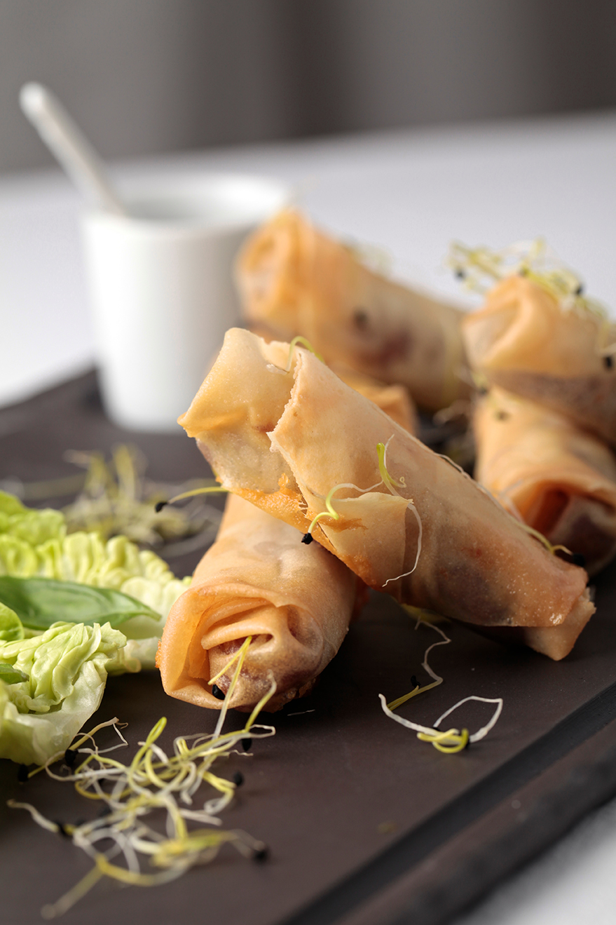 - Rollitos de pato con hojas de lechuga romana y menta y salsa de soja y jengibre.