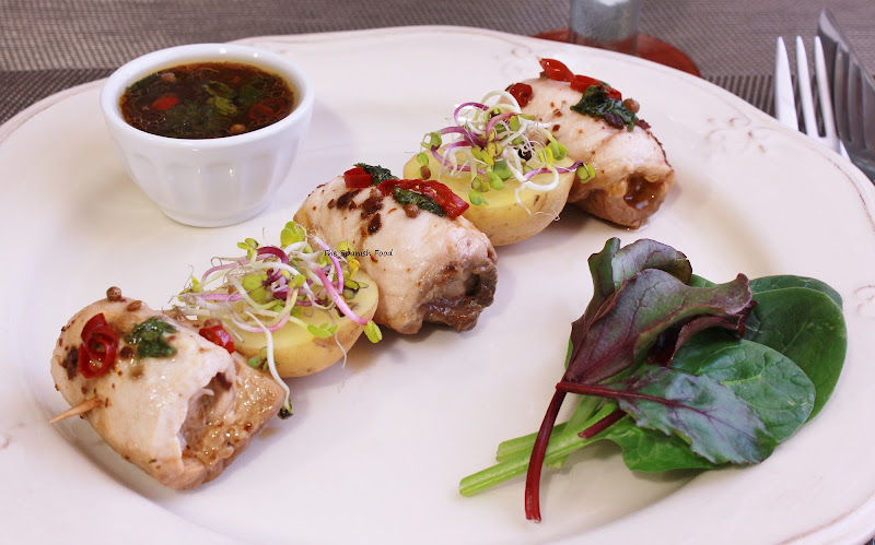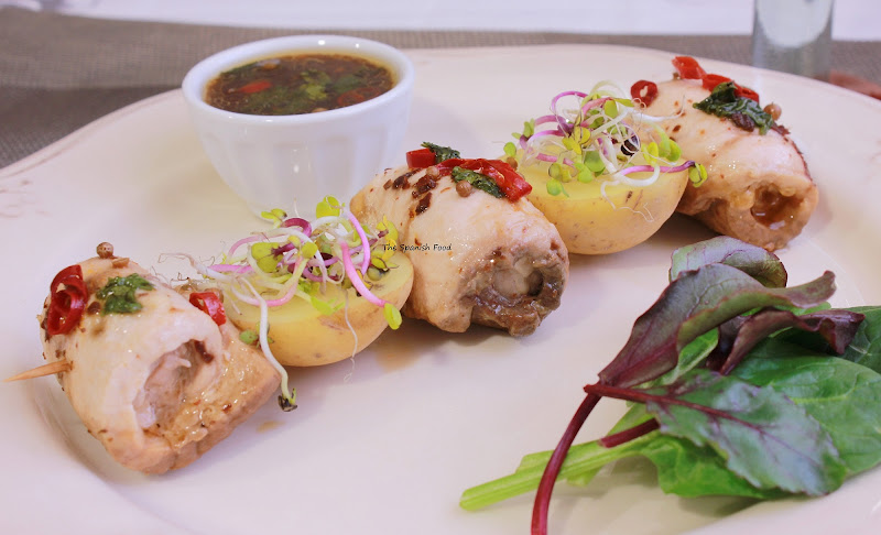 En cada plato, ponemos 2 o 3 rollitos de emperador y dos mitades de patata. Recogemos los jugos del recipiente de cocción al vapor, salseamos ligeramente y servimos el resto en un bol aparte.