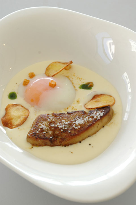» se presenta como una receta de fácil elaboración, en la que el foie se marida con vino de Oporto, se combina a la perfección con el puré de patata, un producto tan cotidiano y sabroso como el huevo, mezcla que se culmina con unas originales patatas chip de nabo.