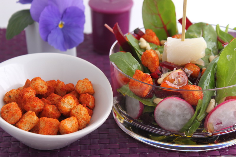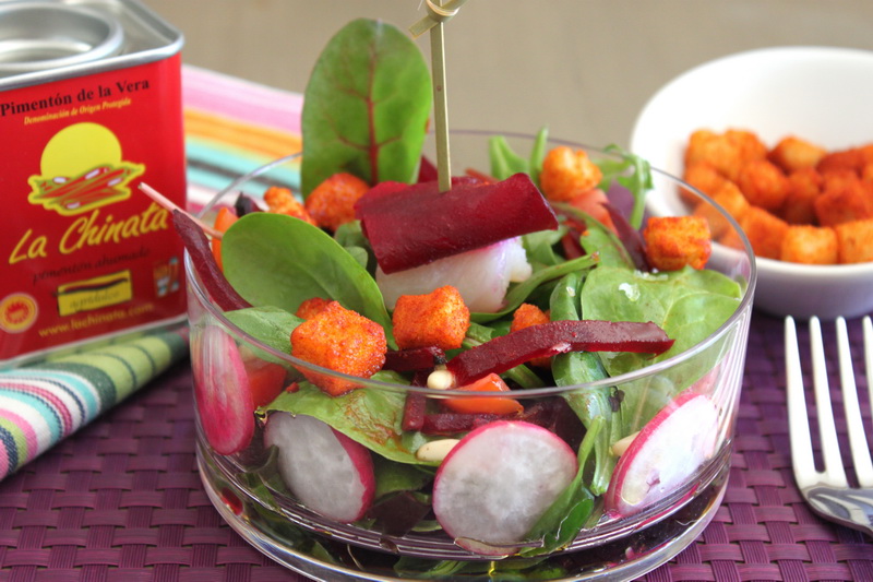 Hacemos cuadrados pequeños con las rebanadas de pan, los freímos en una sartén con un poco de aceite de oliva hasta que estén crujientes, los rebozamos con una pizca de pimentón agridulce y los incorporamos a nuestra ensalada mezclando bien todos los ingredientes.