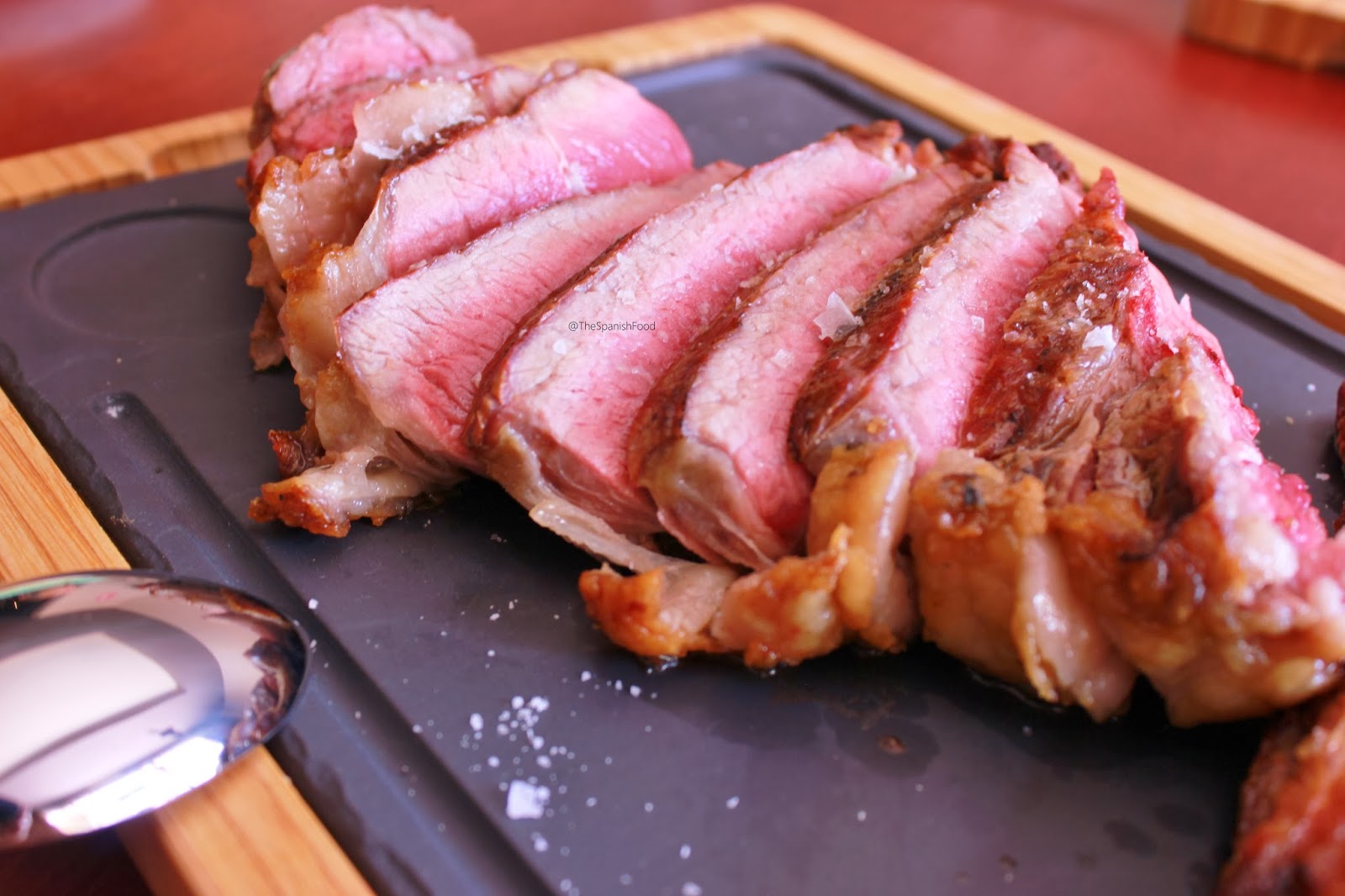 , trinchado, servido sobre una plancha para mantenerlo caliente. Casi 1 Kg de chuletón de buay asturiano a la brasa en su punto, sabroso y tierno.