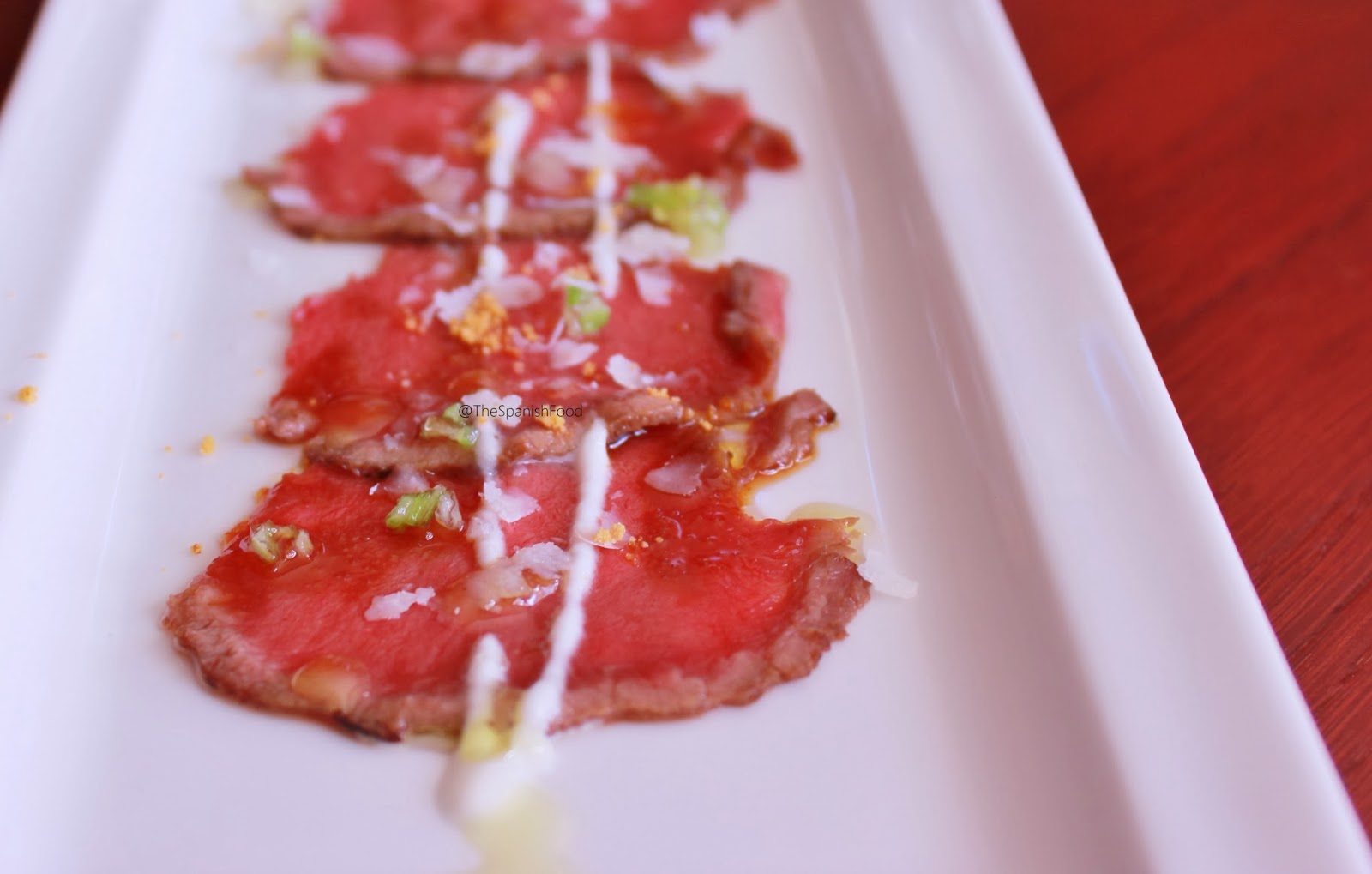 carpaccio de venado con ajoblanco, apio en almíbar, kikos tostados y parmesano
