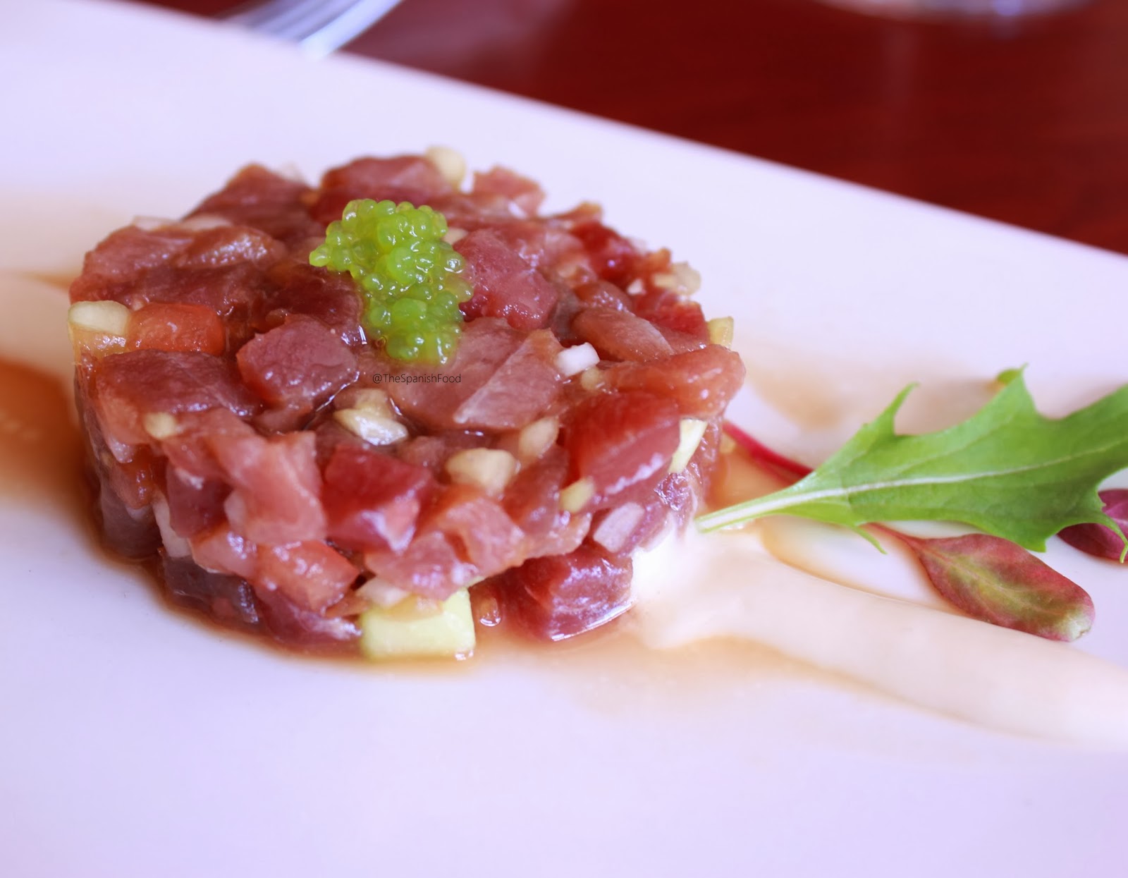 tartar de atún rojo con caviar de wasabi y crema de espárragos blancos