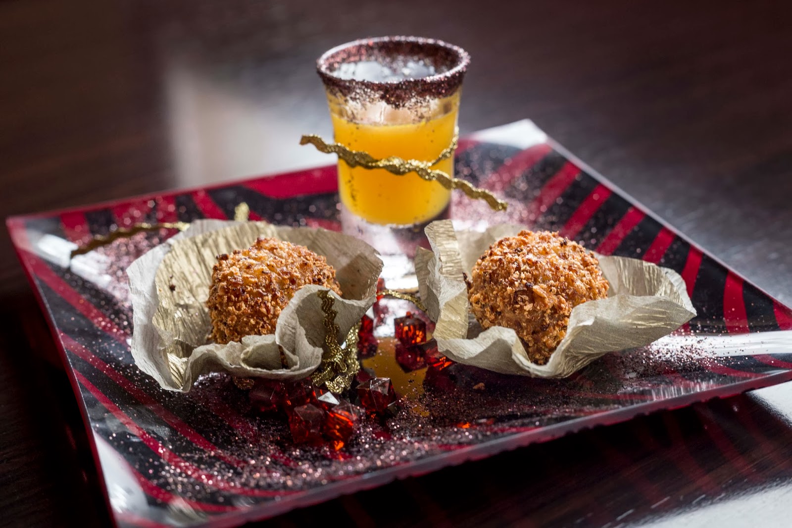 · Bomboncitos y gelatina sobre cama de hongos y tartaleta de chocolate