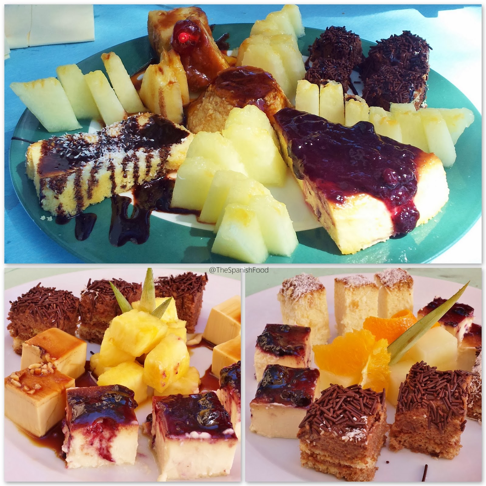 , como ya os he dicho, todos caseros y elaborados por Lorena. Si os gusta el dulce, os va a resultar difícil elegir, así que lo mejor, una degustación de ellos: tarta de queso, flan de huevo, de almendra, de café, tarta de chocolate y coco, de zanahoria, choclate, brazo de gitano relleno de nata y fresas, de chocolate y nata, natillas,... Y algo de fruta fresca, que siempre se agradece: piña, melón, naranja...