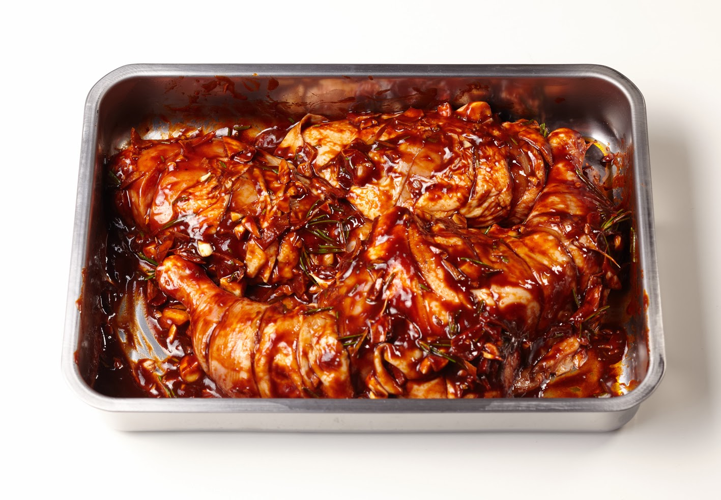 Se realizan pequeñas incisiones longitudinales de un centímetro en el muslo de pollo y mezclamos con profusión en la salsa barbacoa que tenemos en la bandeja preparada.