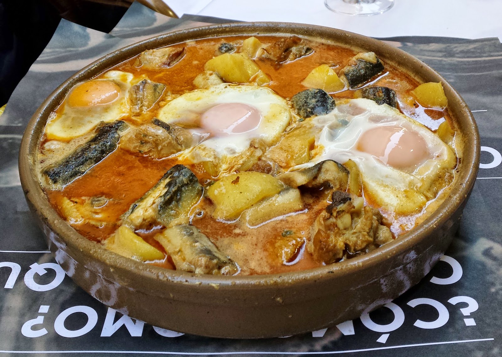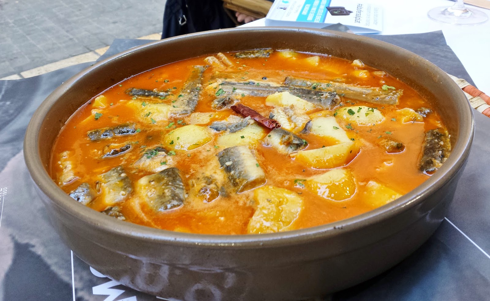 es un guiso tradicional de El Palmar, L'Albufera, con anguila, patata, pimentón y aceite de oliva como ingredientes principales. El caldo, que queda trabado, es delicioso, así que el pan (para "sucar"), es impresindible.