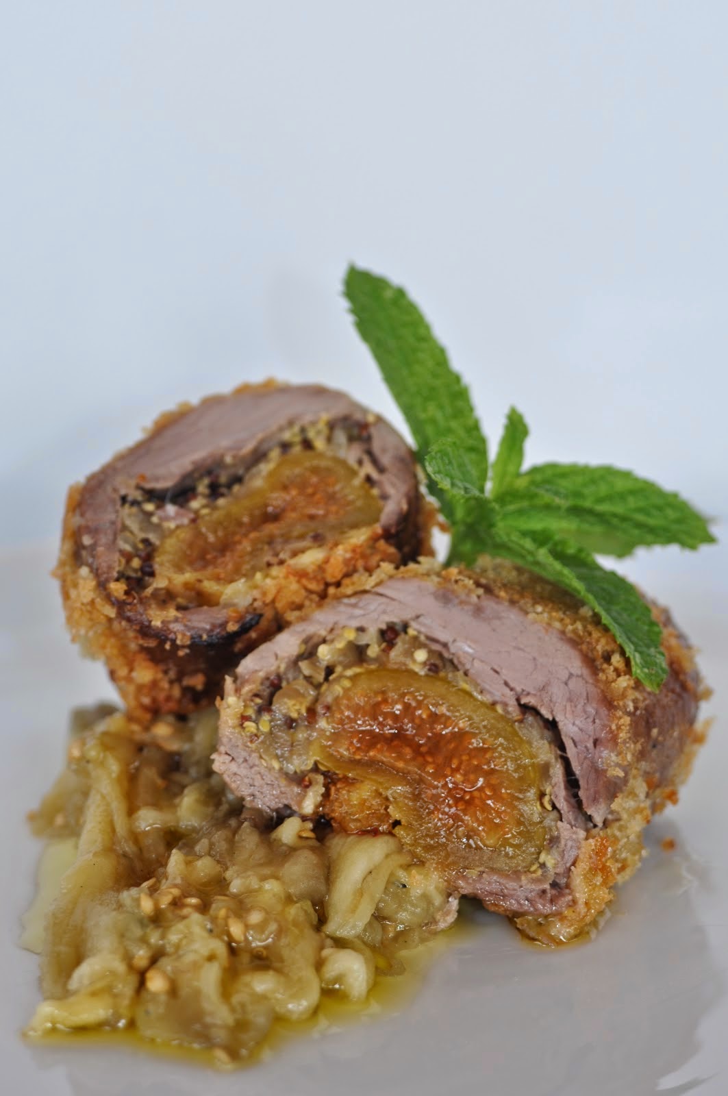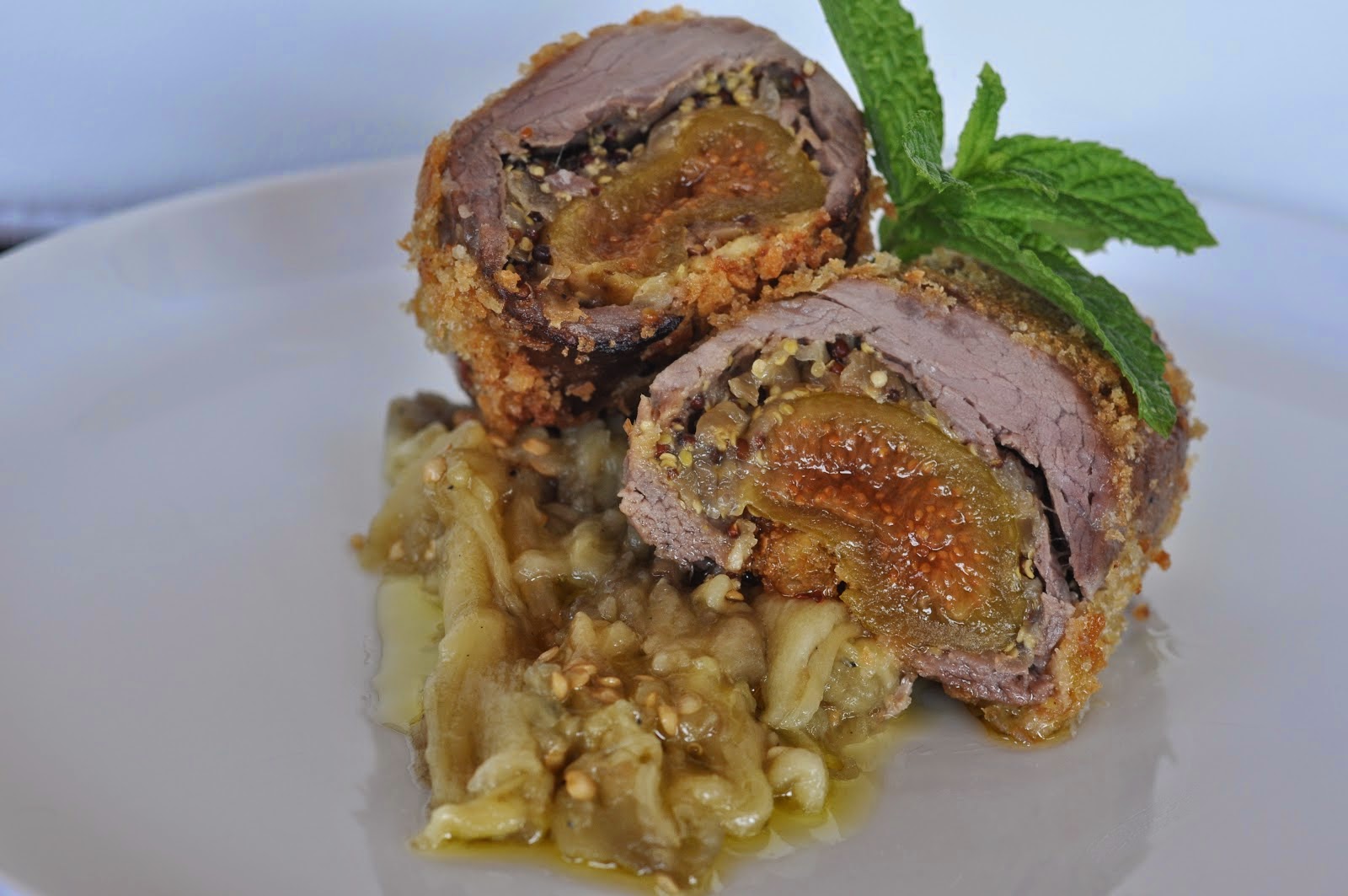 Servir el solomillo ibérico relleno de higos , cortado por la mitad acompañado de las berenjenas asadas.