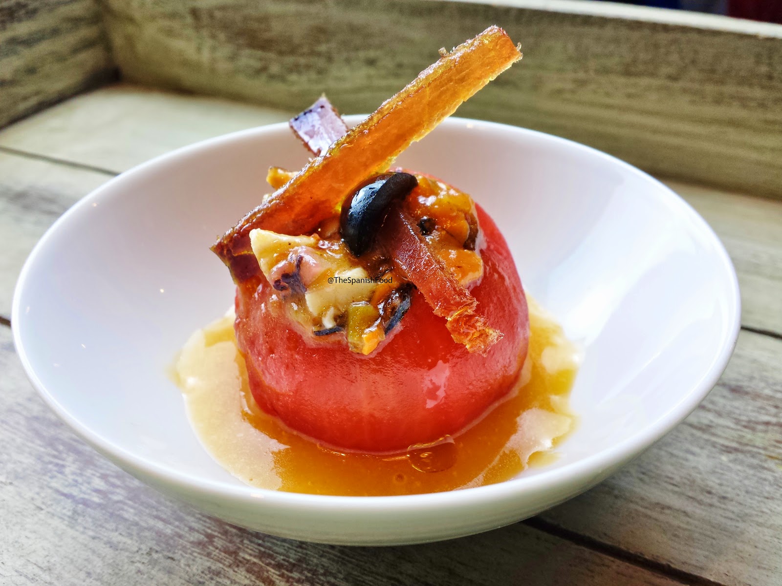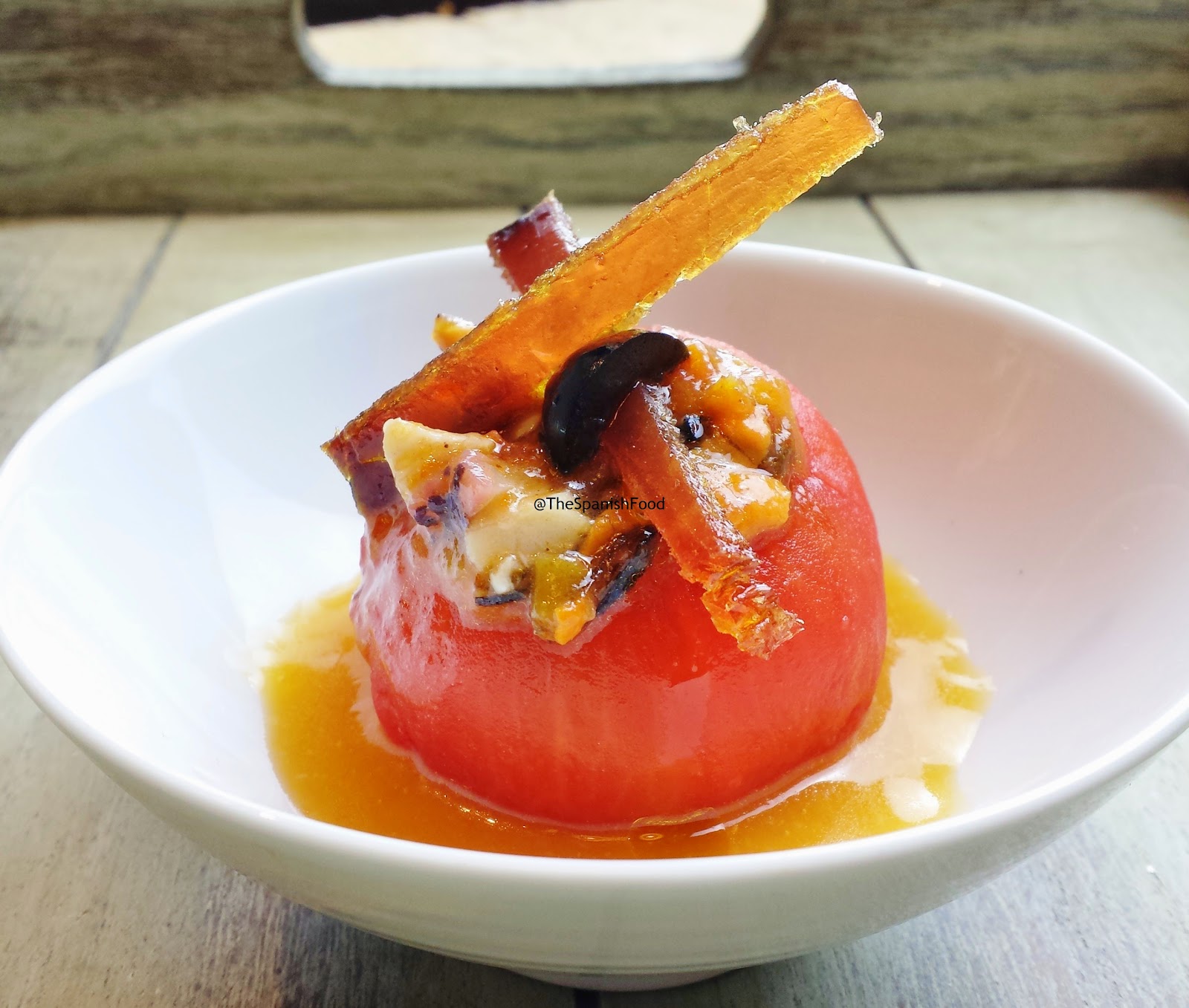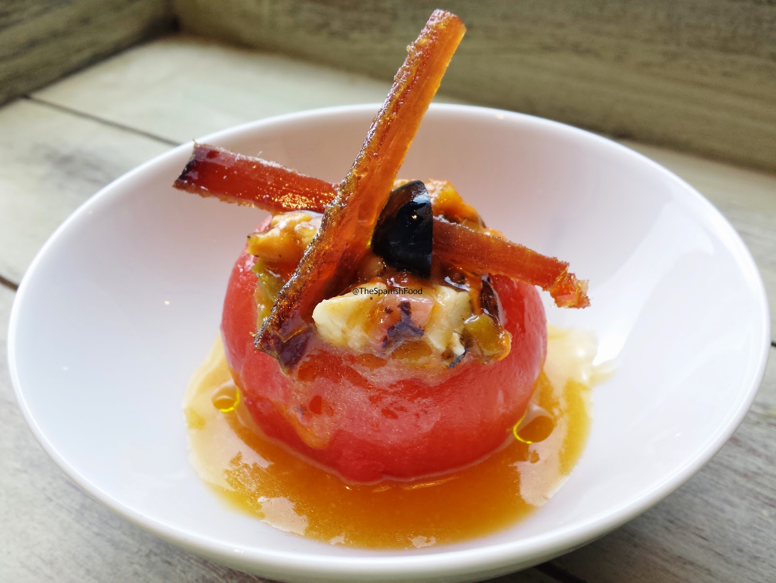 En un plato sopero, ponemos un tomate relleno de salpicón, vertemos el aliño de jugo de asadillo de pimiento rojo y decoramos con las tiras de mojama.