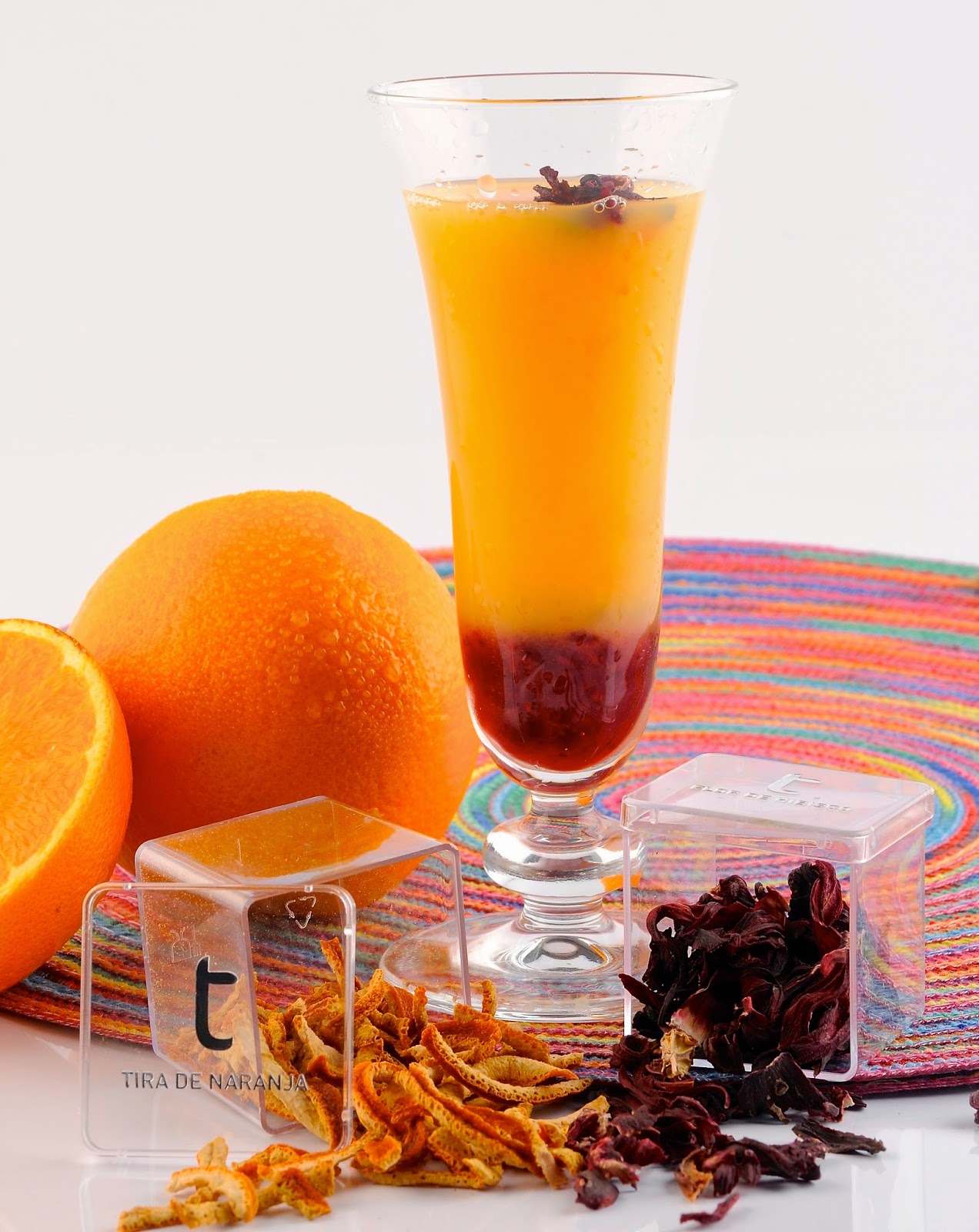 Decoramos con un pétalo de hibisco seco y una tira de naranja seca. Servimos.