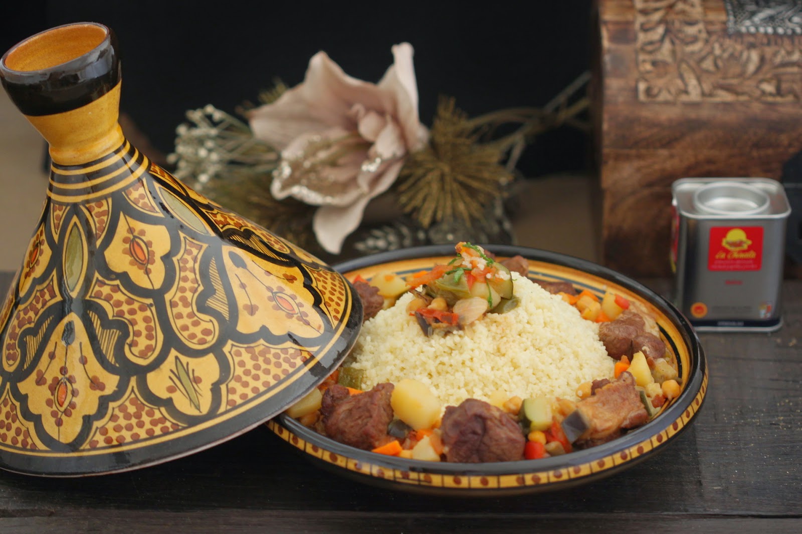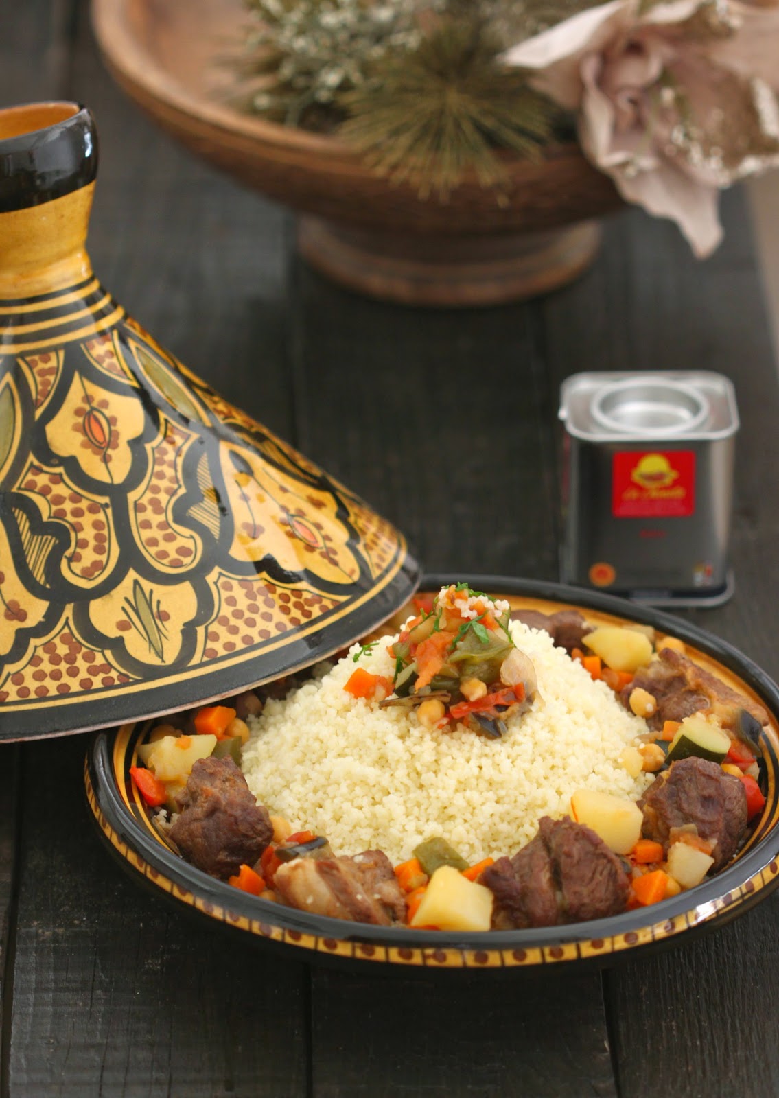 Servimos el cuscús en un tajine o en platos individuales, con la carne y las verduras y hortalizas alrededor.