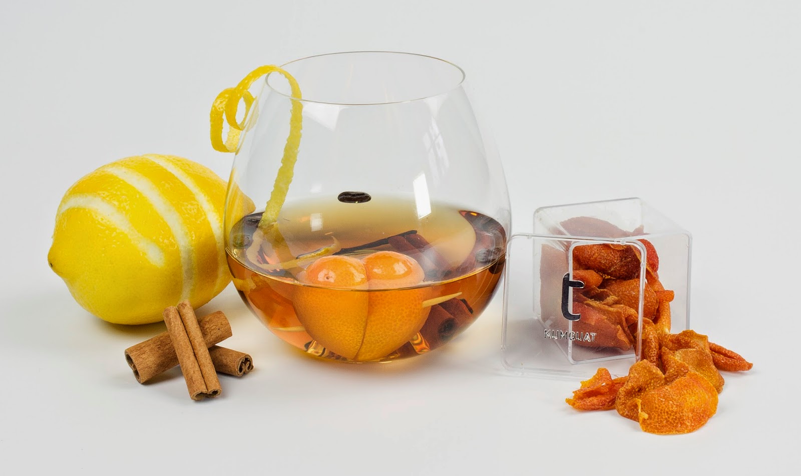 Toque Especial: 4 granos de café gigante; 2 mitades de Kumquat deshidratado; 1 rama de canela Cassia; 1 corteza de limón