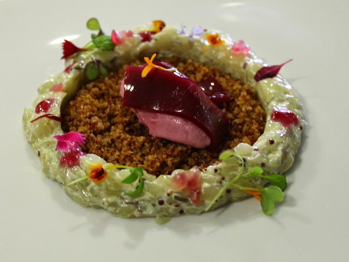 Granada de Elche en texturas con tartar de vieras y migas crujientes