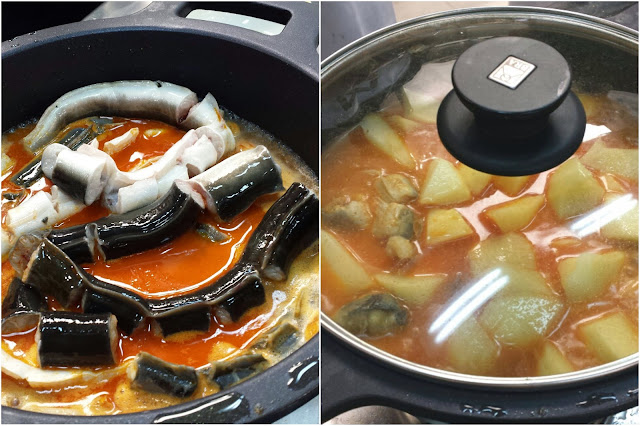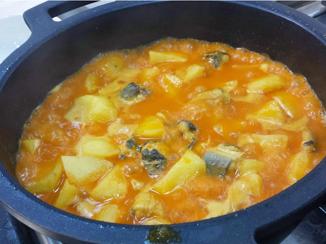 - Cuando pasen los 15 minutos, añadimos las patatas chascadas, rectificamos el punto de sal, y cocemos otros 15-20 minutos con la tapa puesta. Podemos ir moviendo la olla con cuidado para que la anguila no se rompa, y que el caldo 'ligue' y coja espesor.