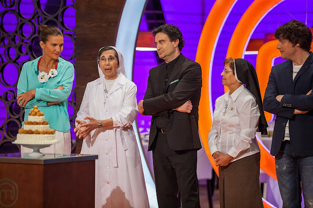 - En la prueba de eliminación, recibirán la visita de dos monjas representantes de la repostería más tradicional. El reto: elaborar una tarta de boda de tres pisos con buñuelos rellenos