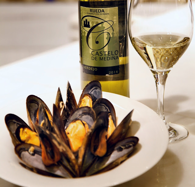 mejillón de Galicia maridado con una copa del vino Castelo de Medina Verdejo 2014