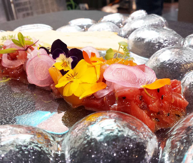 galta de atún rojo y langostino, naranja y salicornia