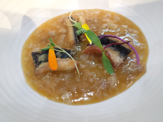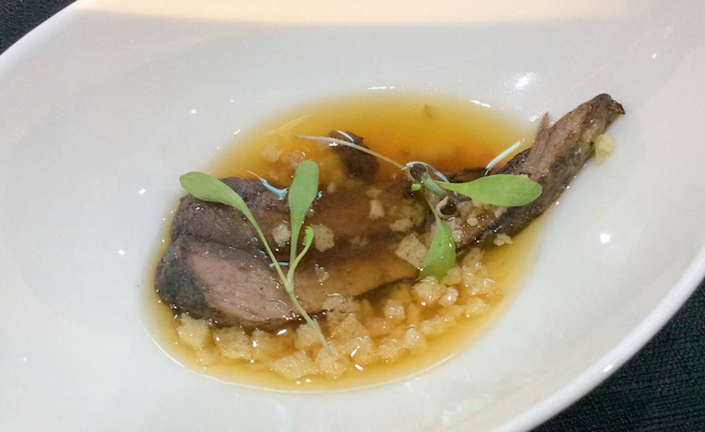 Caballa escabechada con cítricos, manzana acidulada y lacada con su jugo; Langostinos de Vinaroz con fritura invertida, crema de almendra, agua de escalibada y aceite de oliva; y un pie de ternera con anguila ahumada liliáceas y aceite de oliva