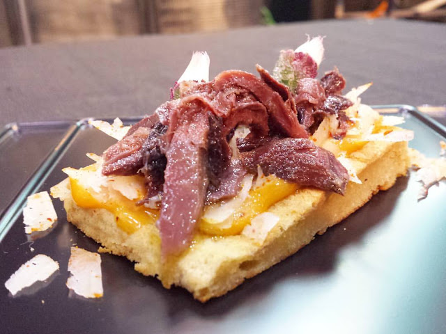 Garrofón con queso artesano de La Loma y coca de sangacho (parte oscura del atún), tomate seco y queso de ñora de La Loma